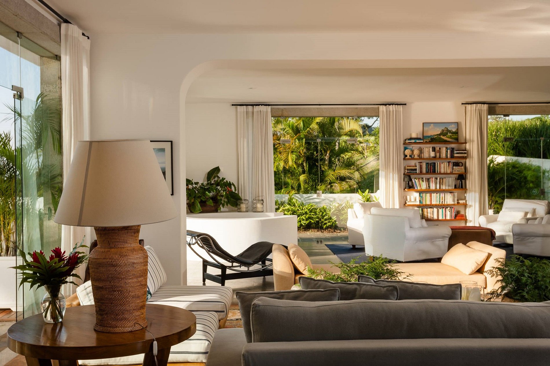 Now available for the first time for private rent, this 7 bedroom villa is located on the privately owned grounds of one of Rio's oldest and most remarkable families, nestled in the heart of Santa Teresa. A complete hideaway in the middle of the city, silent, saved by the sound of birds and breeze in the almond trees, the 1970s modernist white mansion is enveloped in the rainforest of the Atlantic Forest, while views below the Sugar Loaf River, Guanabara's Bay.