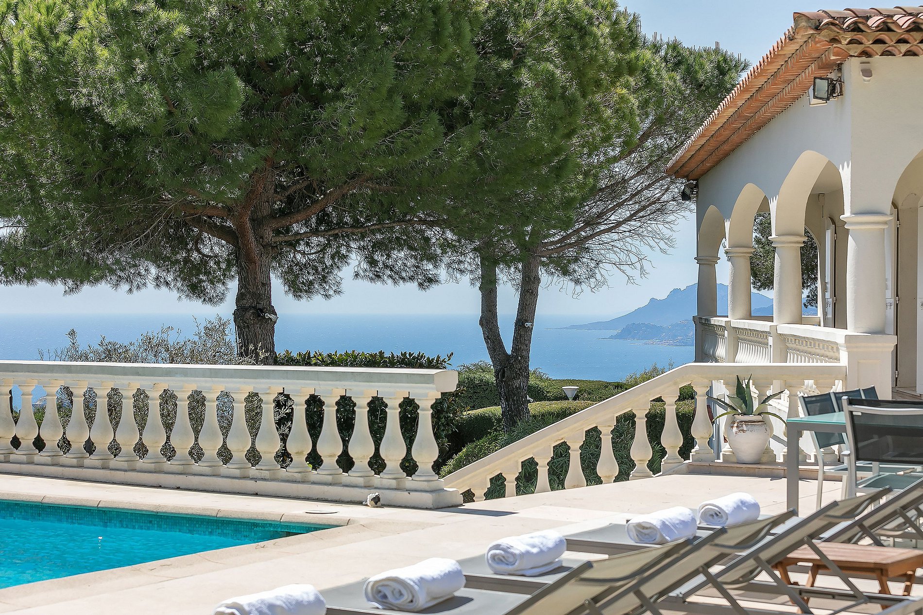 Outdoors, the landscaped garden is a true haven. Tall palm trees and manicured lawns surround a generous 10 x 5-meter swimming pool, inviting you to cool off in the southern sun. A charcoal barbecue is available for long summer lunches or candlelit dinners under the stars.