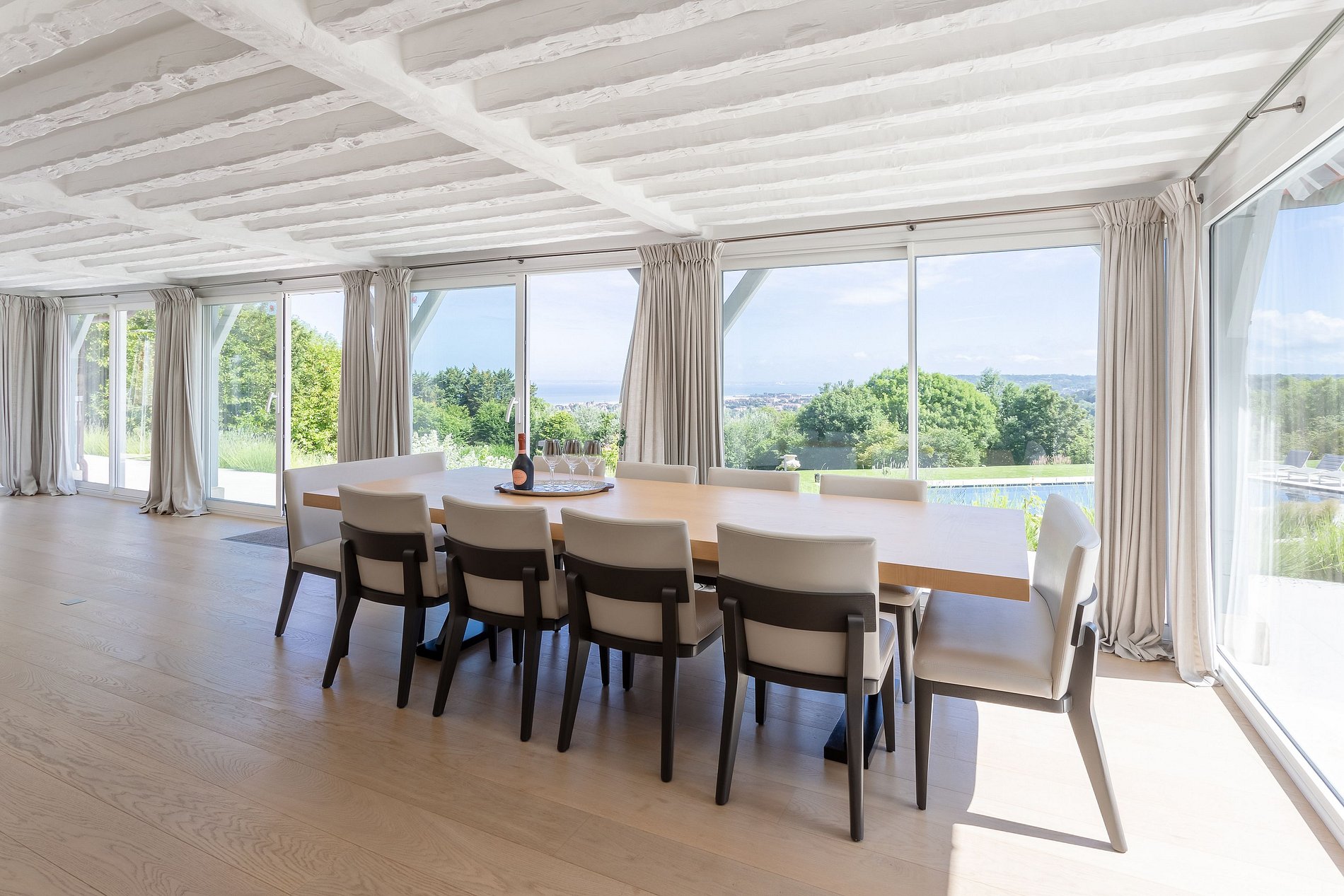 • Panoramic dining room opening onto a large terrace with outdoor dining area and built-in barbecue