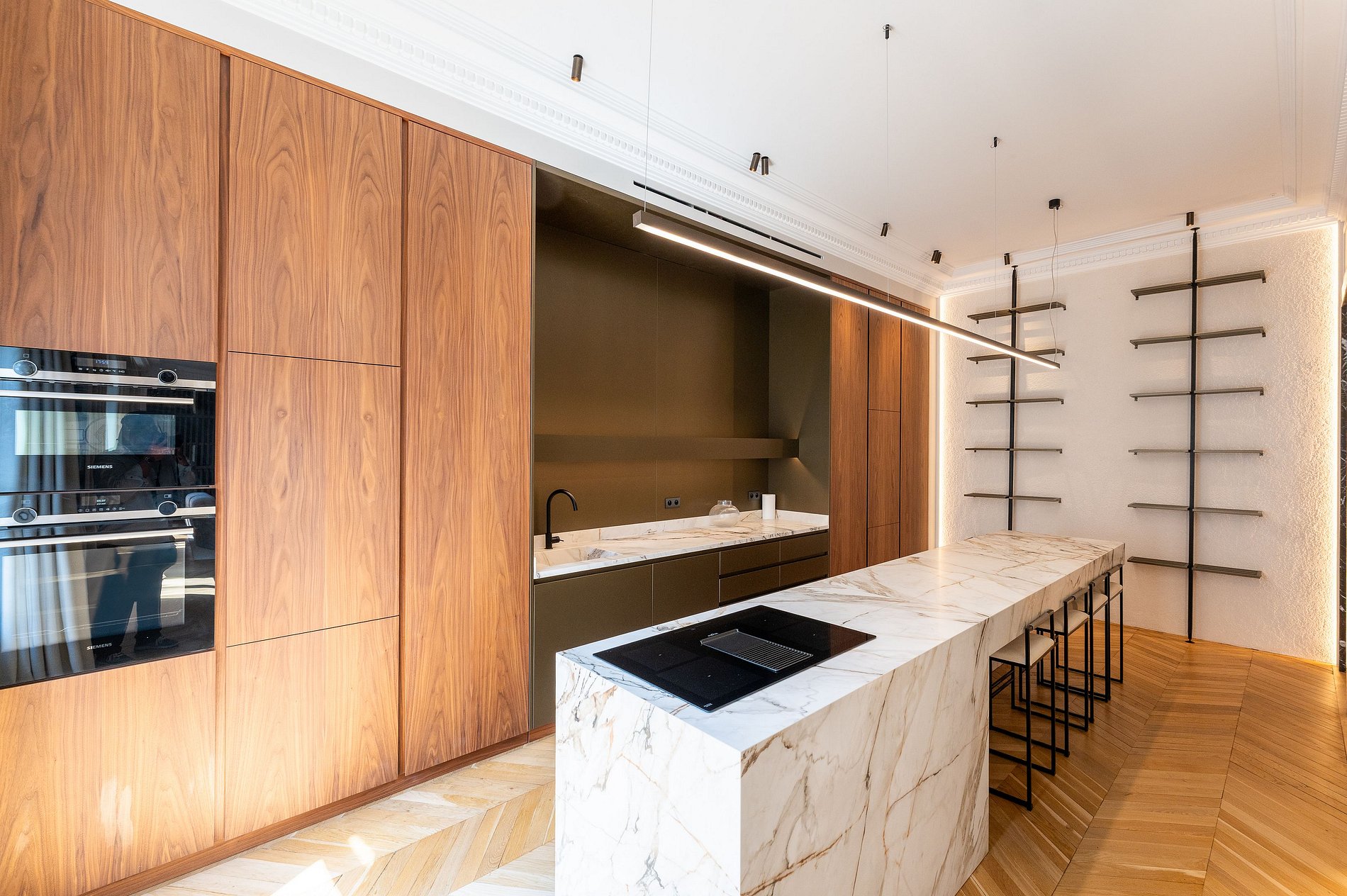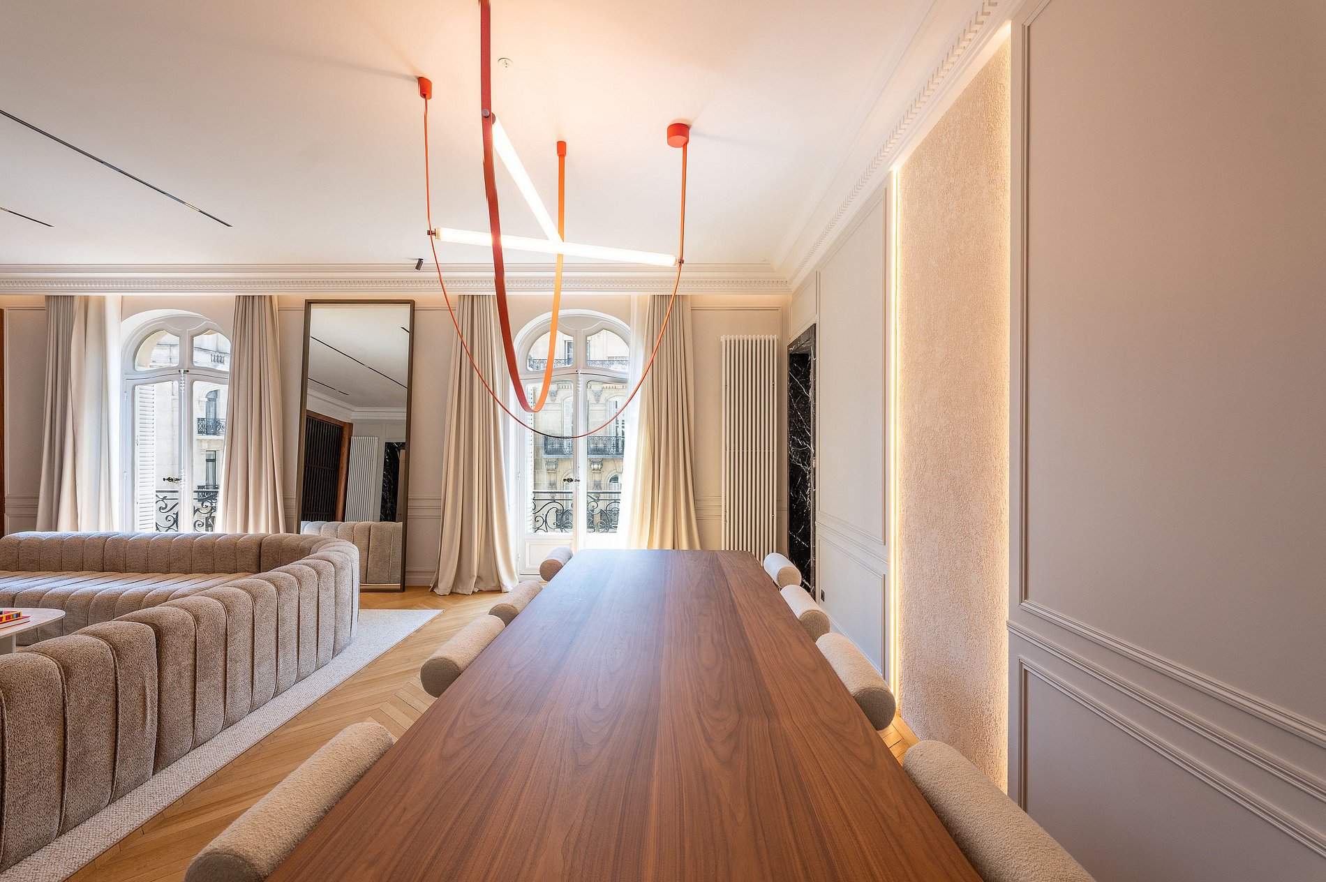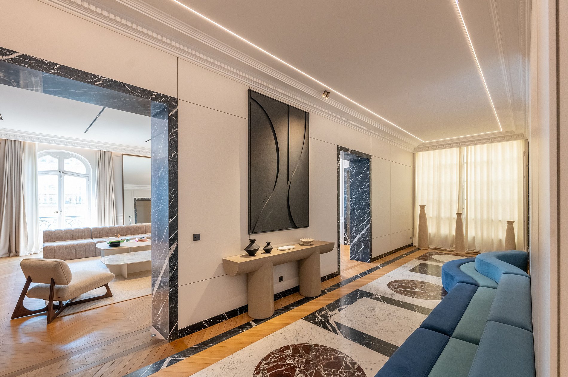 Situated in an upscale Haussmannian building with refined amenities, this apartment stands out for its remarkable architectural design, notably highlighted by a spectacular hallway featuring a unique mirrored wave ceiling—truly an aesthetic marvel.