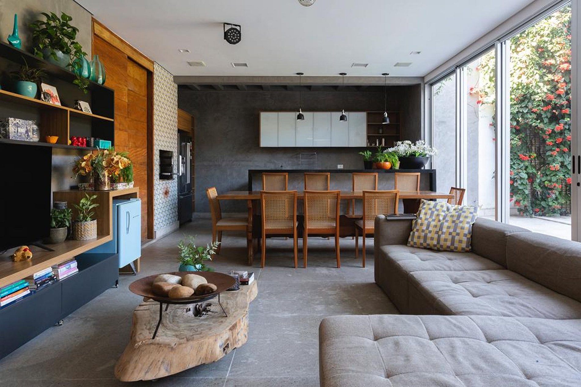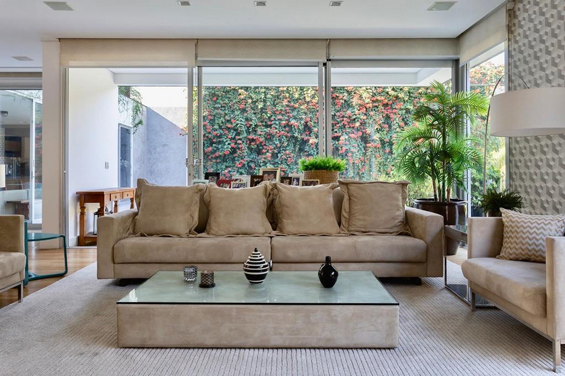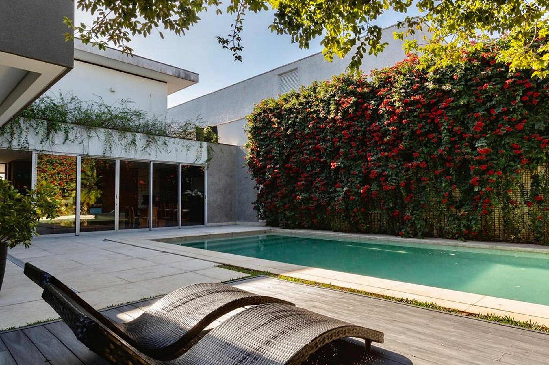 This area gives access to the external area, facing the beautiful swimming pool with its magnificent vertical garden full of red flowers. A true paradise in the heart of the city of São Paulo.