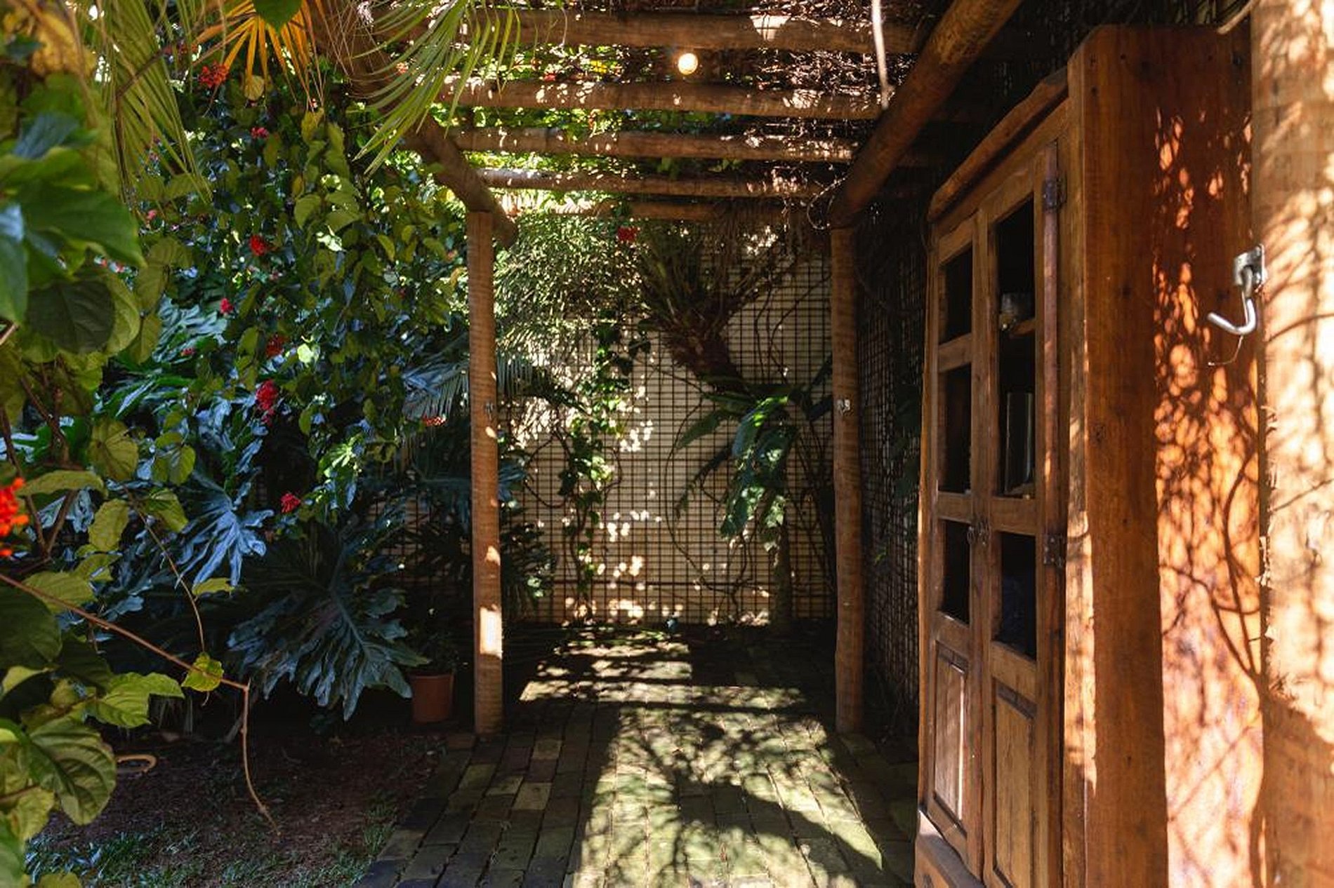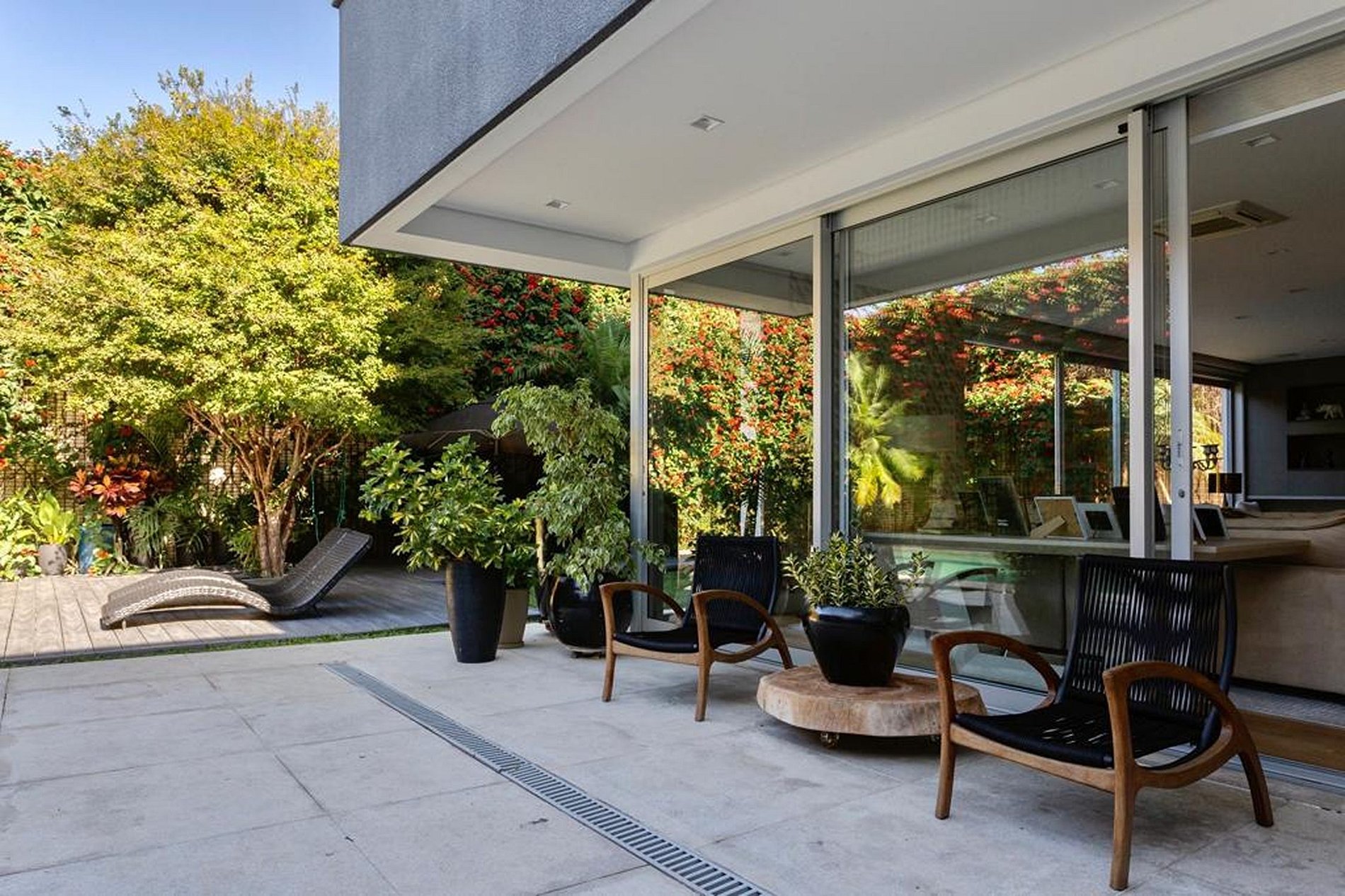 This area gives access to the external area, facing the beautiful swimming pool with its magnificent vertical garden full of red flowers. A true paradise in the heart of the city of São Paulo.