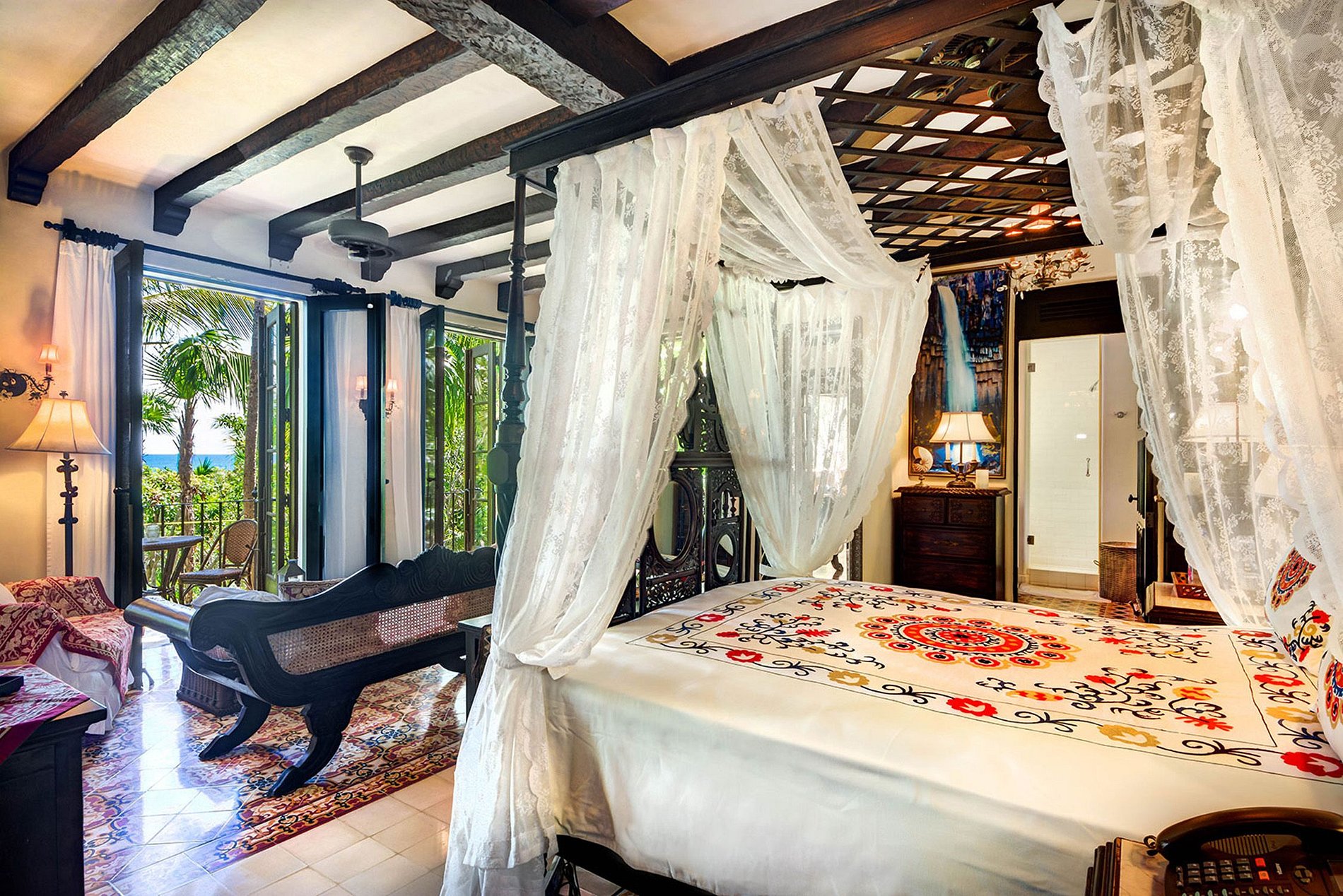 Queen sized canopy bed, Air conditioning, Ceiling fan(s), Ensuite bathroom with rainforest shower, Hairdryer, Ocean views with private terrace, Outdoor rainforest shower, Private office, Safety box, Toiletries, Walk in closet, Wifi access, Wrap around verandah