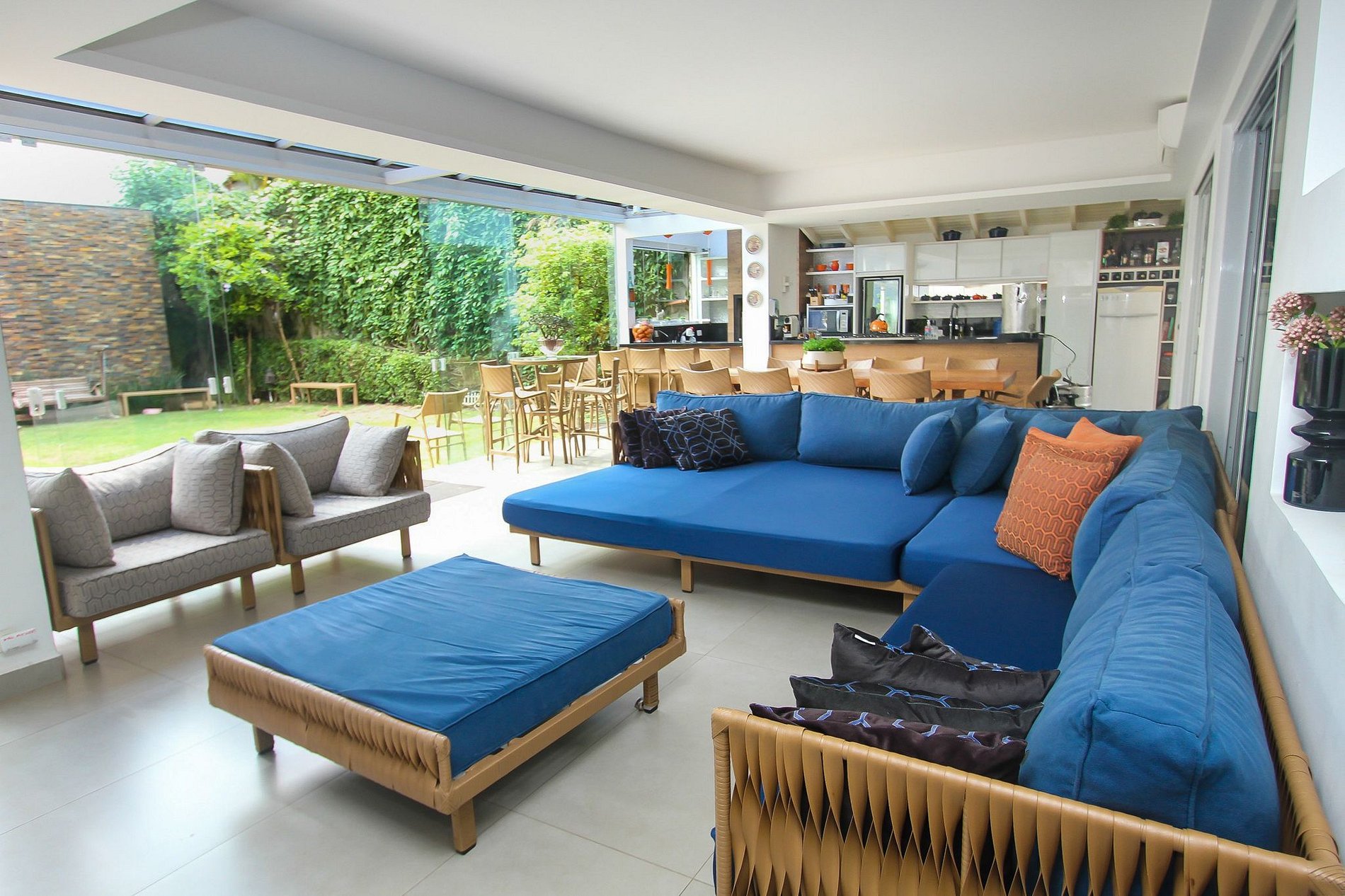 The house in its exterior has a large garden with an outdoor seating area with custom sofas and a dining table. Its kitchen is spacious and fully equipped, it has a barbecue and a beer cooler. Inside the house, what stands out is the black and white living room.