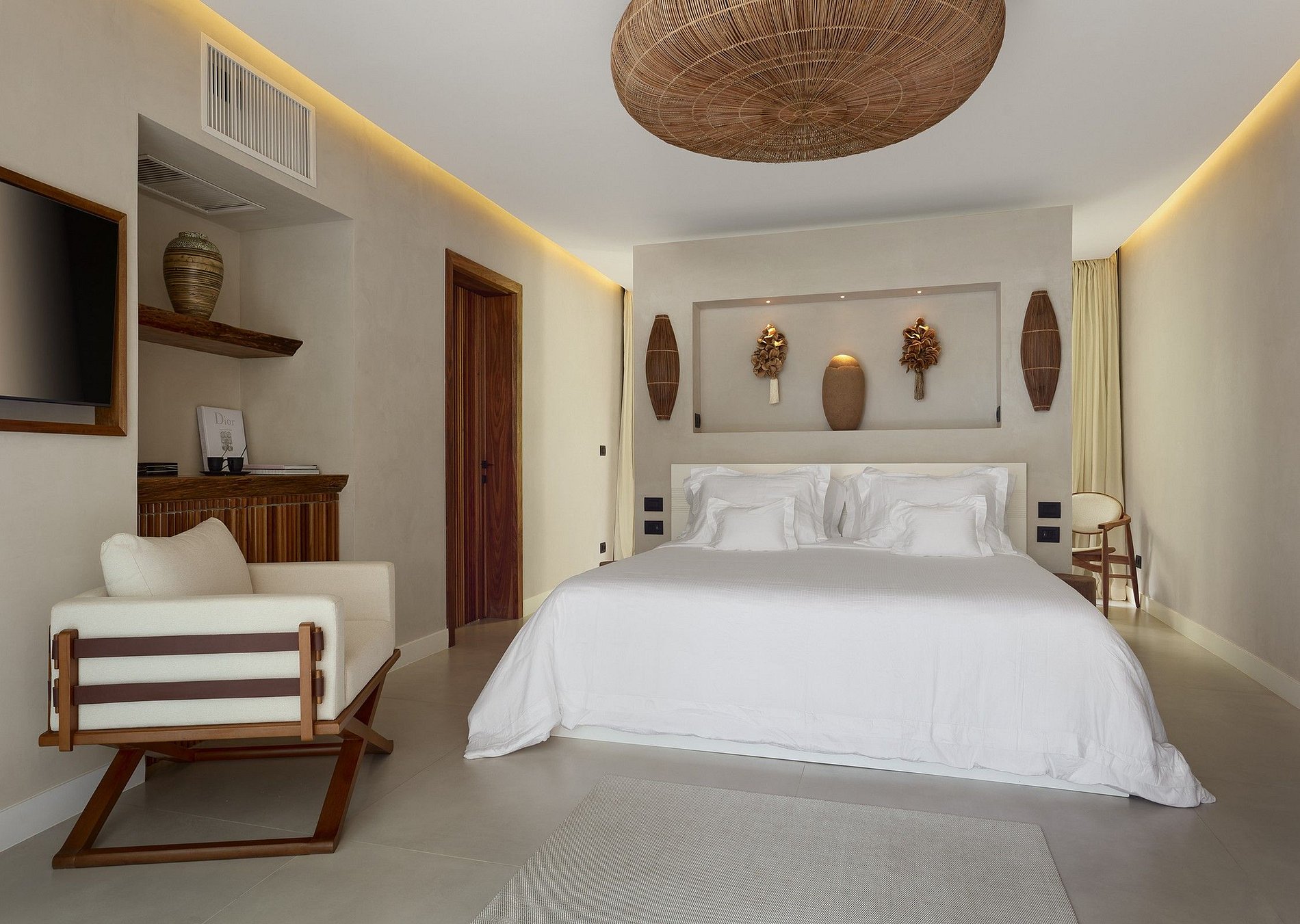 On the first floor there are 3 of the 6 luxurious suites, all air conditioned and equipped with king-size beds with 600 thread-count linens, sofas, a desk, a 50-inch TV, a minibar and a private bathroom with a natural stone wall.