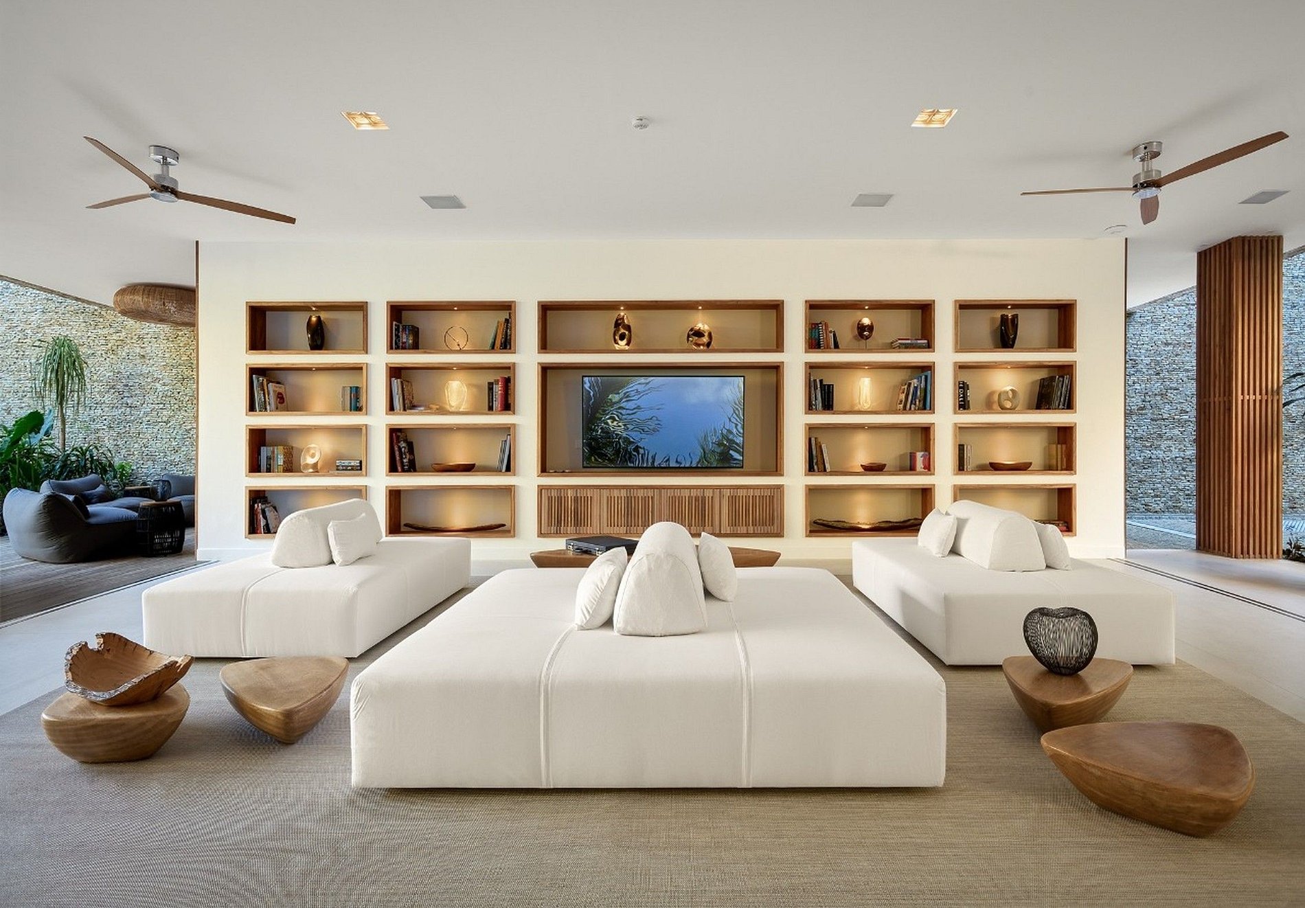 The house combines charm and luxury in all its rooms, starting with the large open living room which allows the entry of sunlight from east to west: decorated with three large sofas, side tables and a 60 inch television, which provides an exceptional audio-visual experience. In the background is the elegantly decorated bar, a great spot for lively, fun moments.