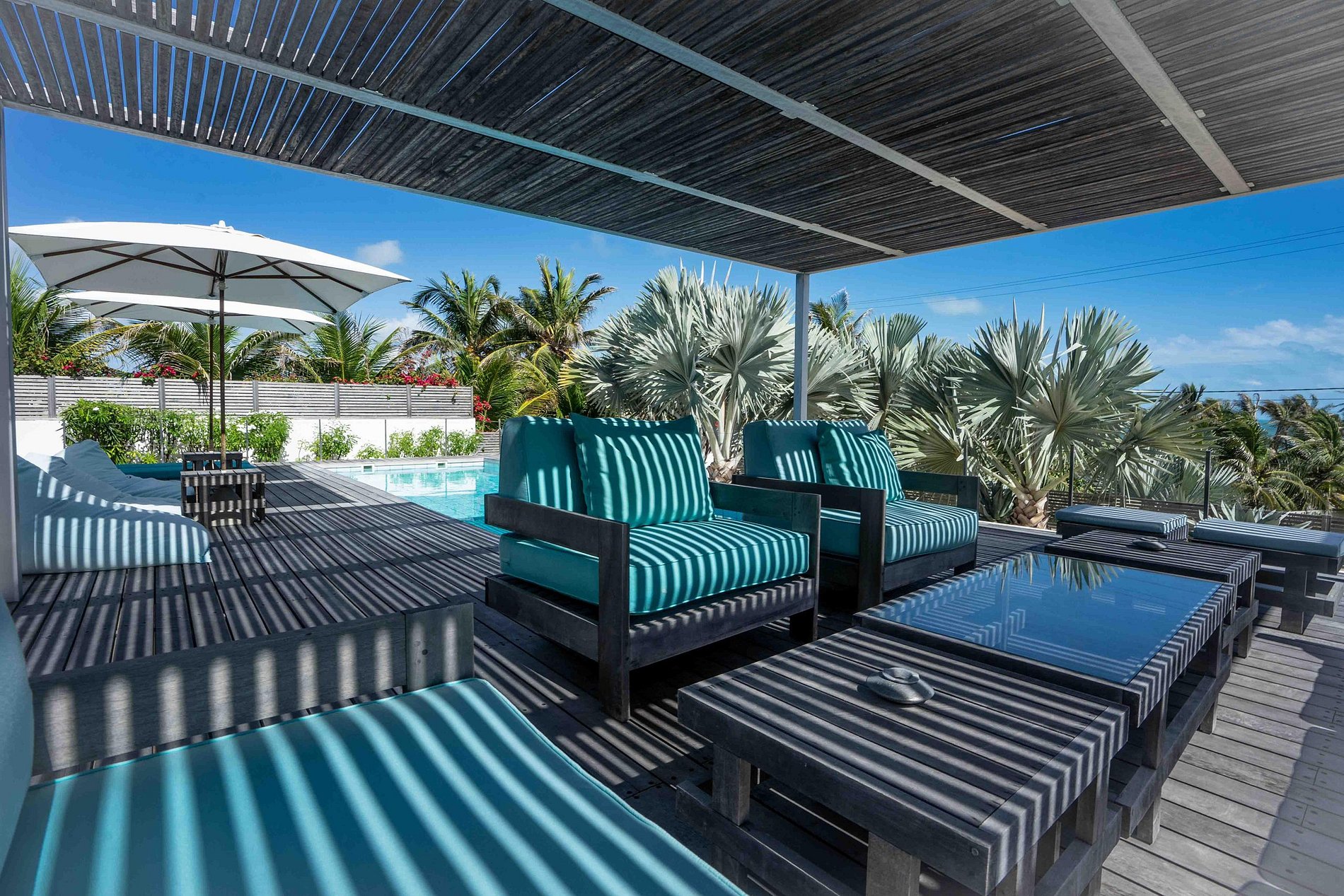 Do lado de fora, um deck em madeira envolve a piscina de borda infinita, com vista privilegiada para o mar. Espaços de convivência incluem área gourmet coberta, lounge ao ar livre e espreguiçadeiras estrategicamente posicionadas para relaxar ao sol.