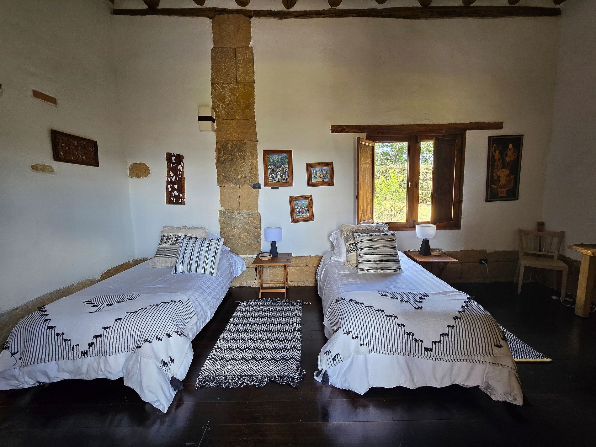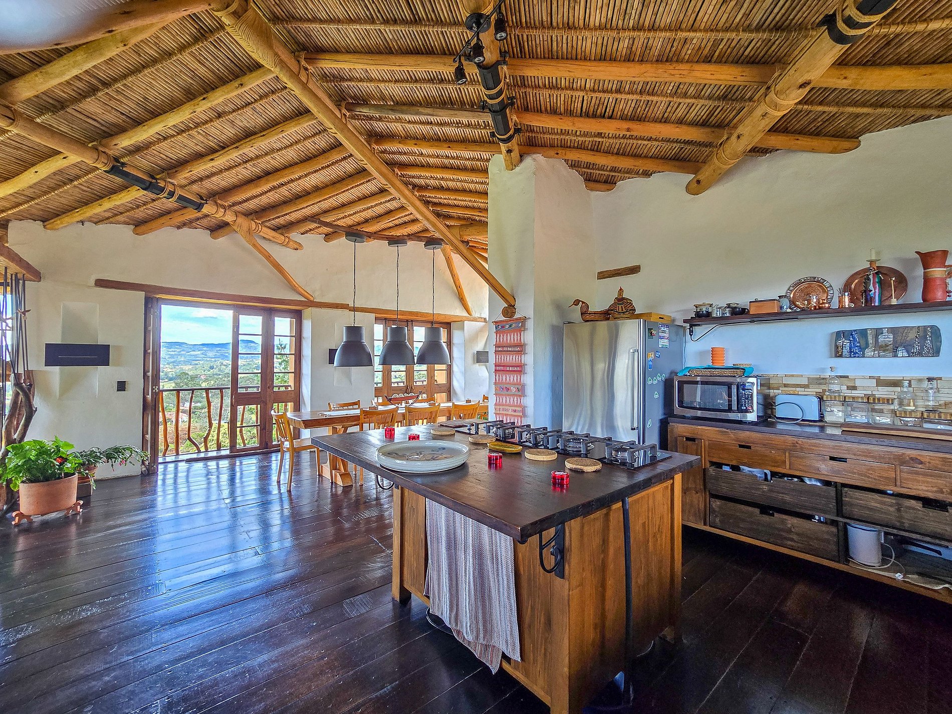 This one-of-a-kind villa sits just minutes above the historic center of Villa de Leyva and offers sweeping views of the mountains and valleys that surround the town. Built with rammed earth walls and finished with carved stone, wood, and traditional cane ceilings, the architecture blends perfectly into its natural setting while providing comfort, style, and total privacy.