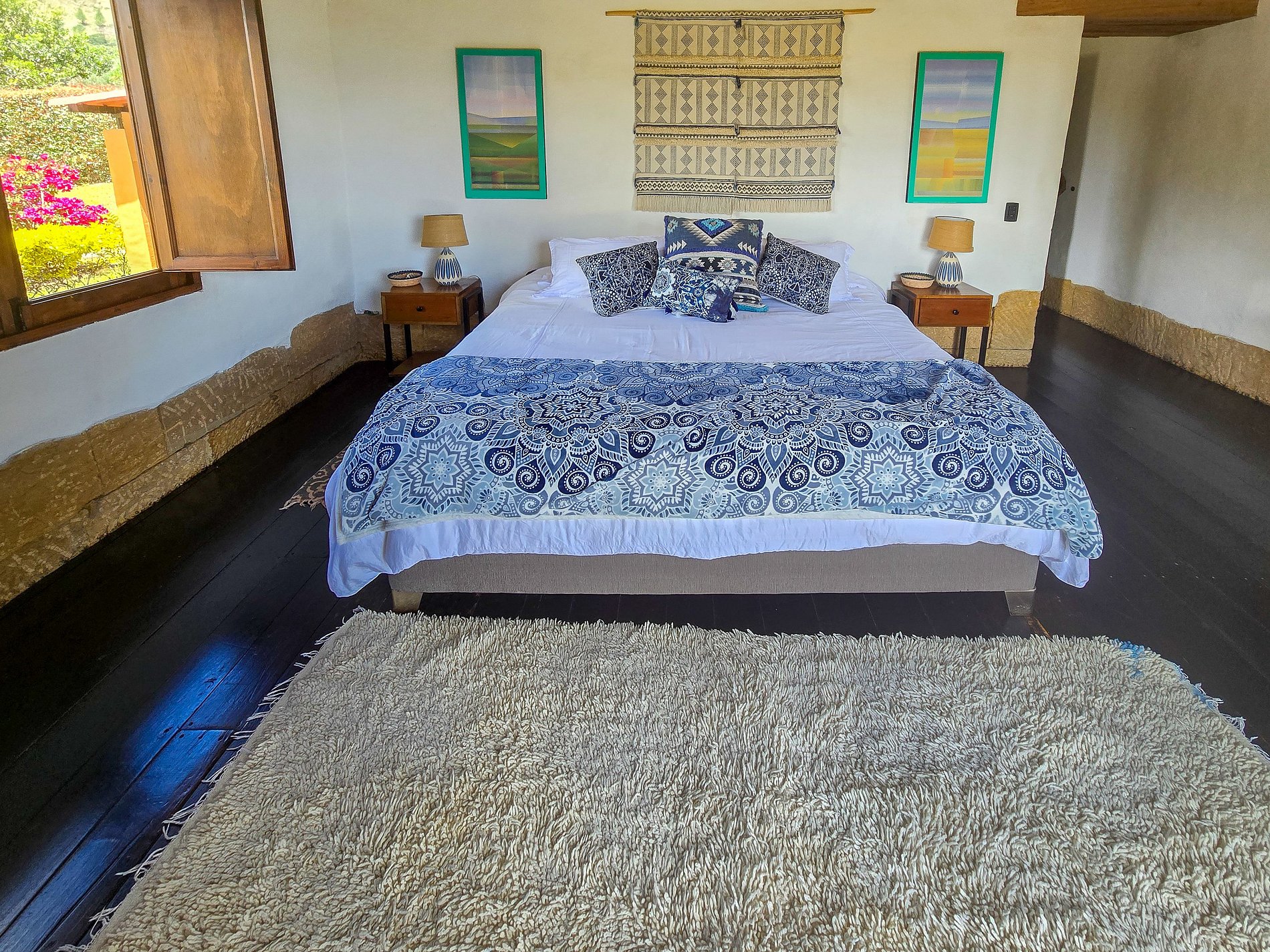 This one-of-a-kind villa sits just minutes above the historic center of Villa de Leyva and offers sweeping views of the mountains and valleys that surround the town. Built with rammed earth walls and finished with carved stone, wood, and traditional cane ceilings, the architecture blends perfectly into its natural setting while providing comfort, style, and total privacy.