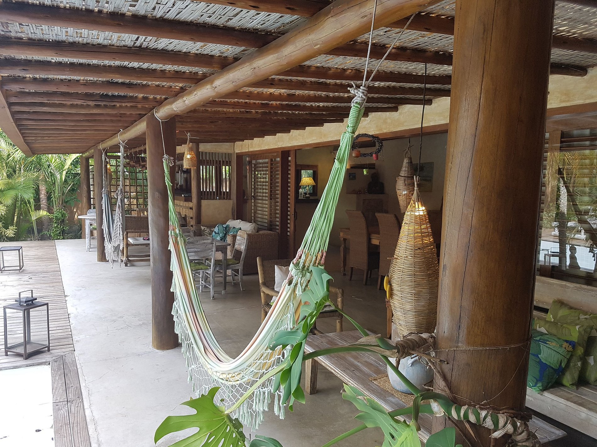 Very beautiful tropical garden with many species of plants, very green. In the middle of the garden, a covered double bed. In a corner of the tropical garden, a covered space called "Espaço Caraíva" with a large table and two large eucalyptus benches that can accommodate more than 10 people. Barbecue with refractory bricks, refrigerator.