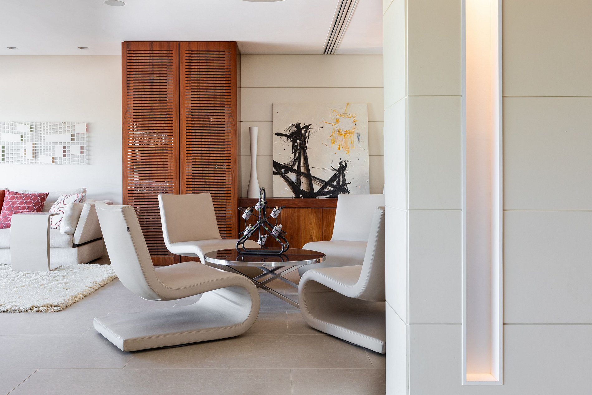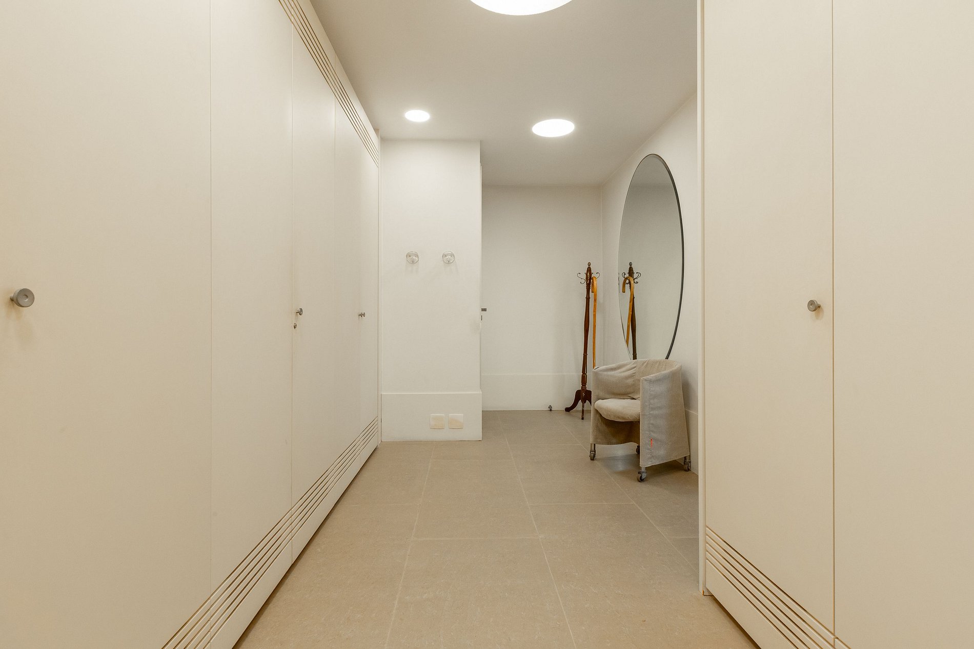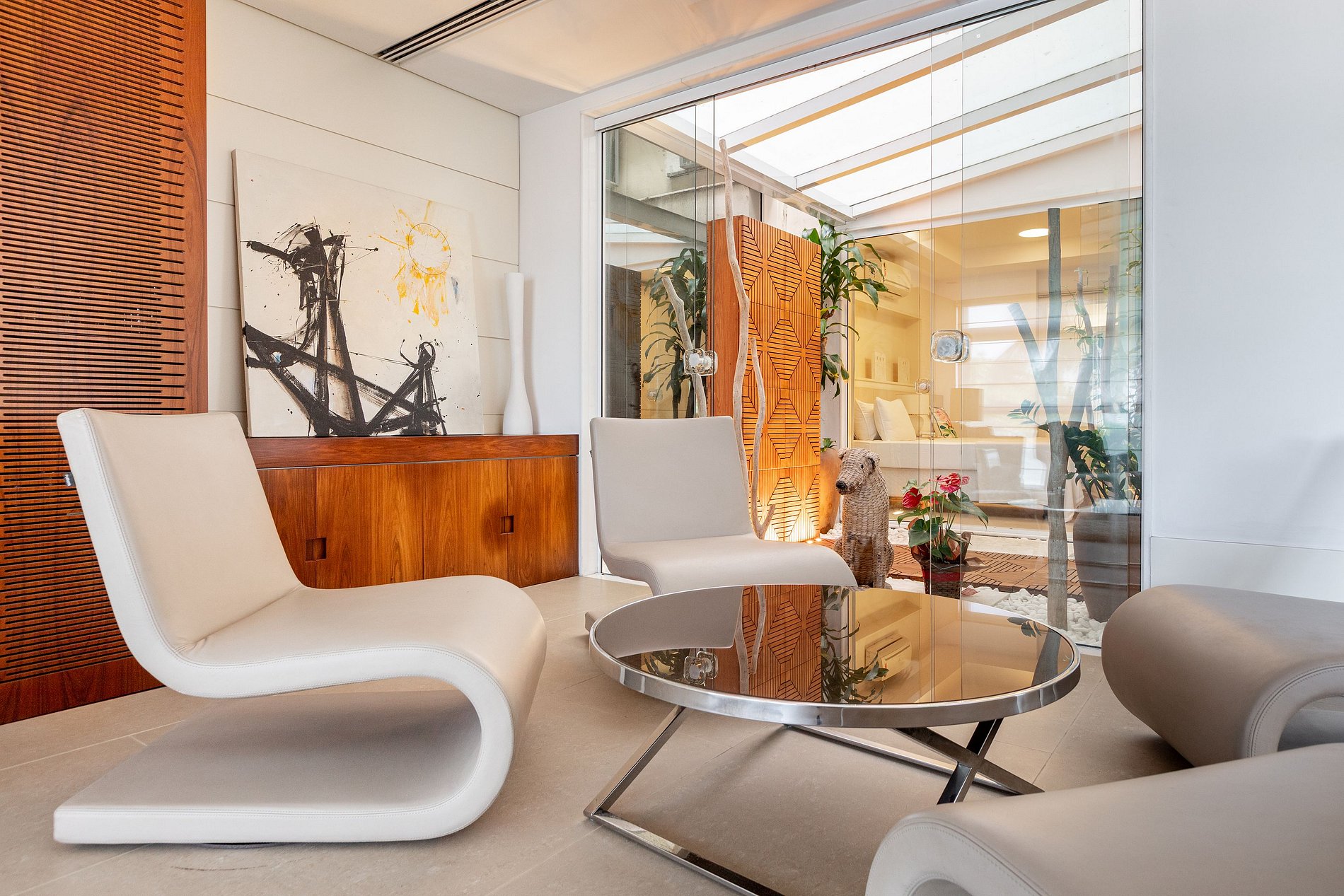 The spacious and contemporary living room is divided into two integrated areas, including a space that can be adapted as an office. The seamless connection with the dining area enhances natural light and frames the ocean view. At the heart of the layout, a charming decorated winter garden adds a touch of coziness and exclusivity to the space.