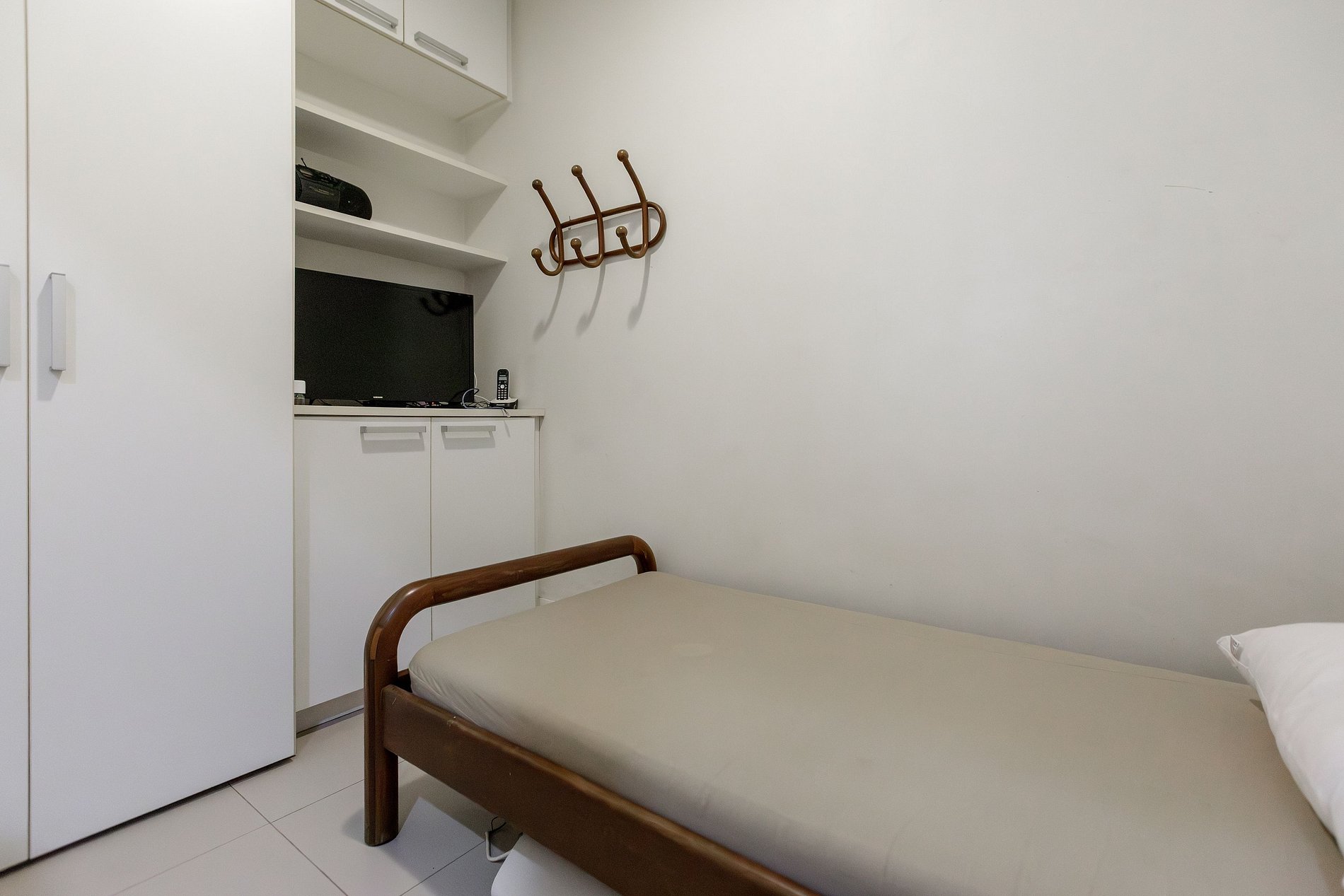 The private area features two bedrooms. The master suite is fitted with a double bed and a walk-in closet, while the second bedroom offers two single beds.