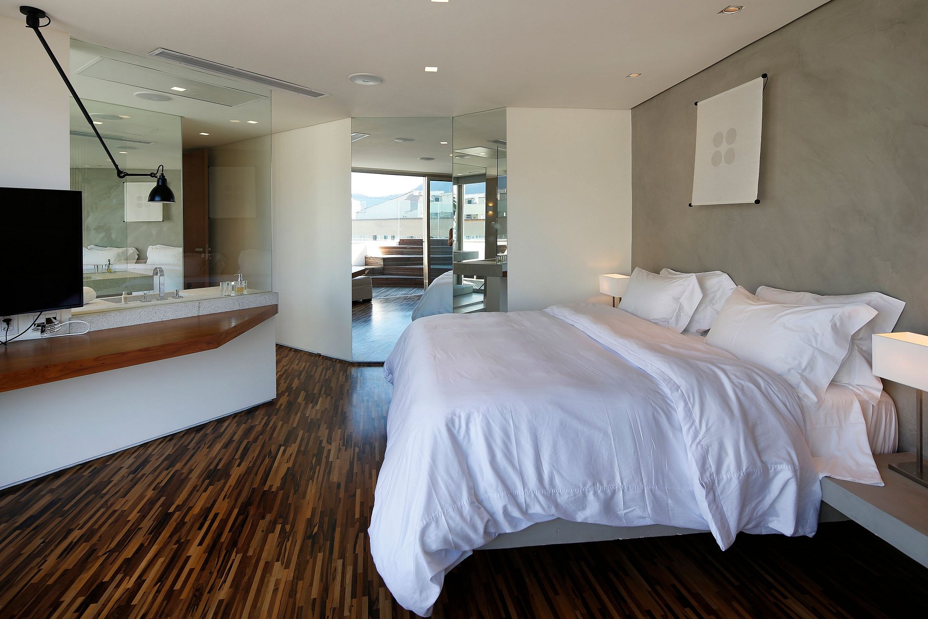 The apartment measures 300m² of total area and has 3 large suites. These and their respective bathrooms were designed in super exclusive, modern and bold style. The common area has a completely reformed kitchen and finished in burnt cement, which combine perfectly with the advanced stainless appliances. The main lounge has floor-to-ceiling windows and a dining table for up to 6 people.