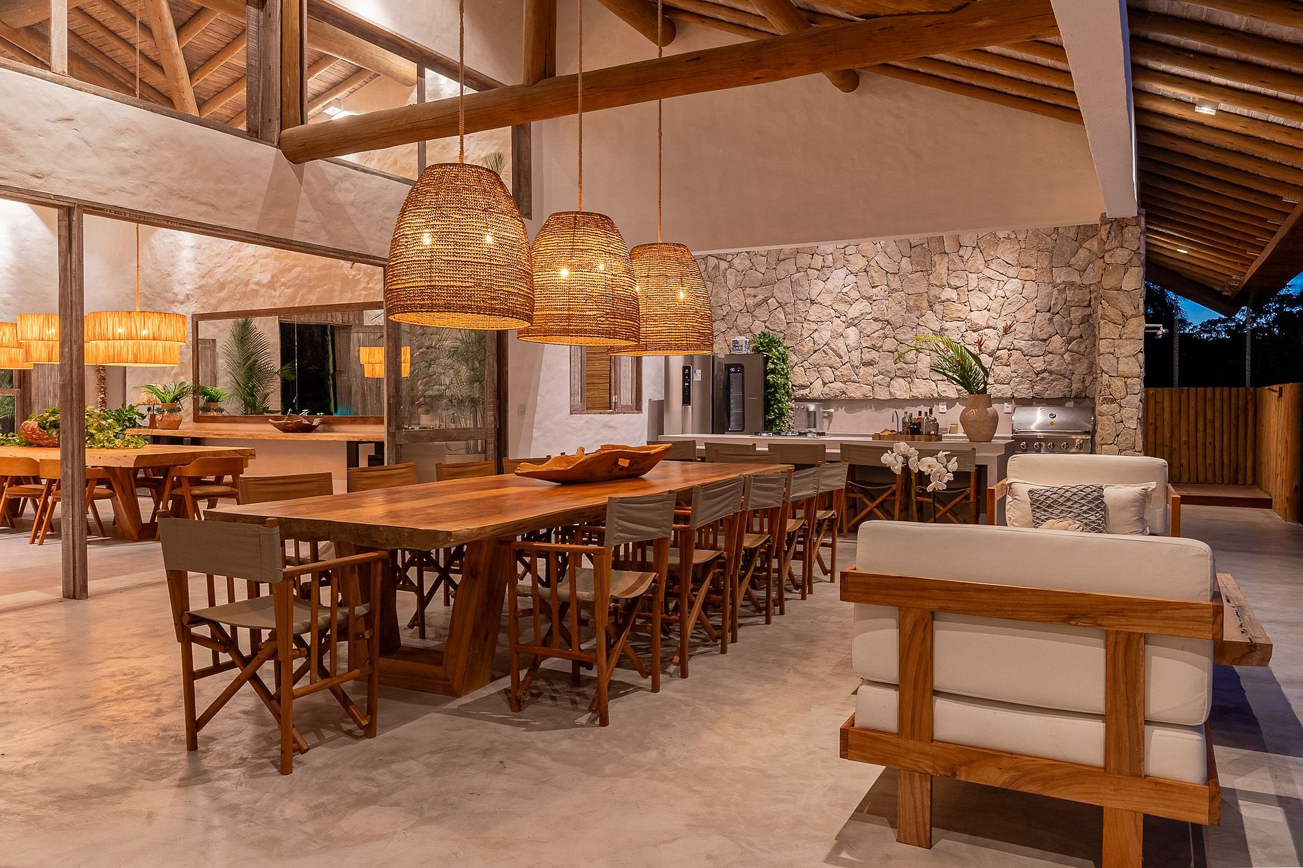 Upon entering the house, a spacious living room and dining room open up, with a table for 12 people. Next door is the TV room: air-conditioned, with a home theater, a 75-inch TV, and comfortable sofas. The balcony, with its own porch chairs and sofas, features another 12-seat dining table. The gourmet kitchen is equipped with an electric grill, ice maker, beer cooler, two refrigerators, and a countertop with a cooktop.
