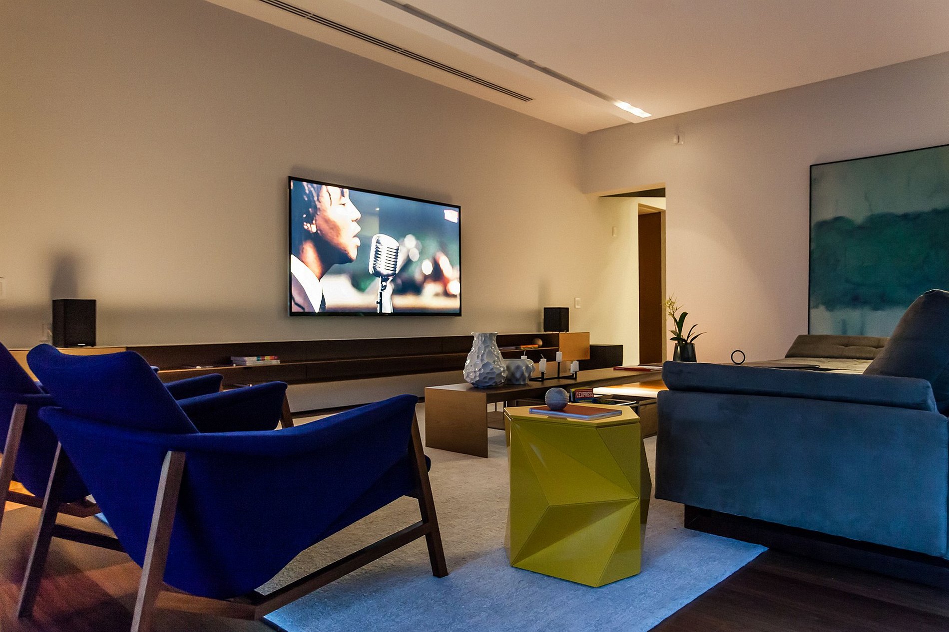 The TV room was designed for excellence and comfort due to its climate-controlled environment, its beautiful sofas and the audiovisual experience with ts large TV and its speakers strategically placed for an immersive experience when watching movies and series.