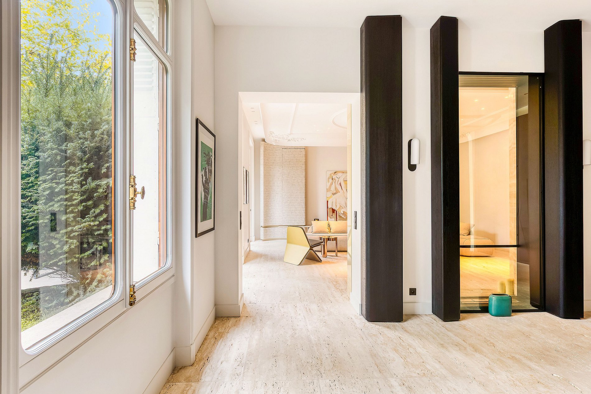 Completamente revestido de mármol travertino italiano, se abre a un magnífico jardín privado de 180 m² y cuenta con una entrada independiente directamente accesible desde la avenida.