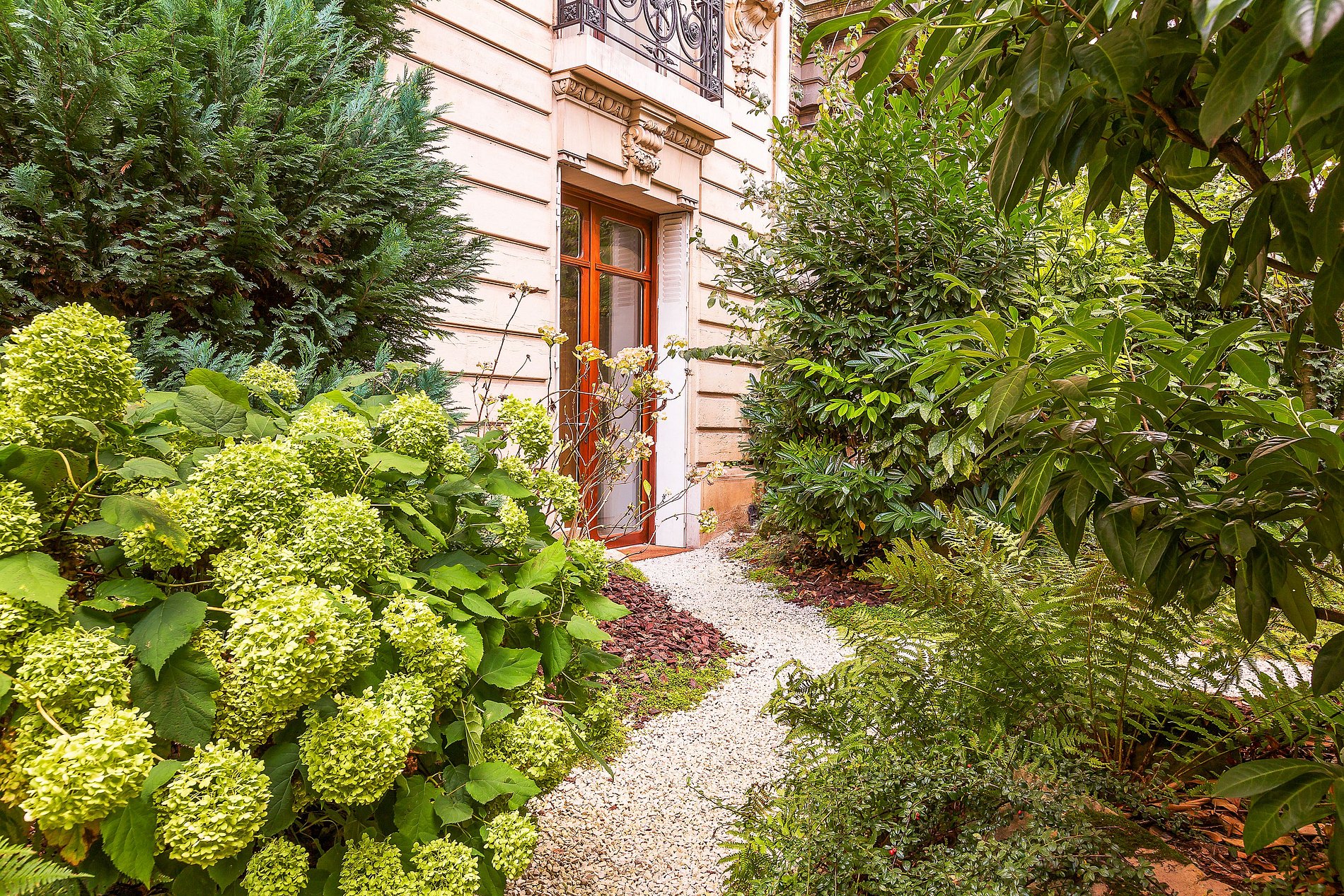 Completamente revestido de mármol travertino italiano, se abre a un magnífico jardín privado de 180 m² y cuenta con una entrada independiente directamente accesible desde la avenida.