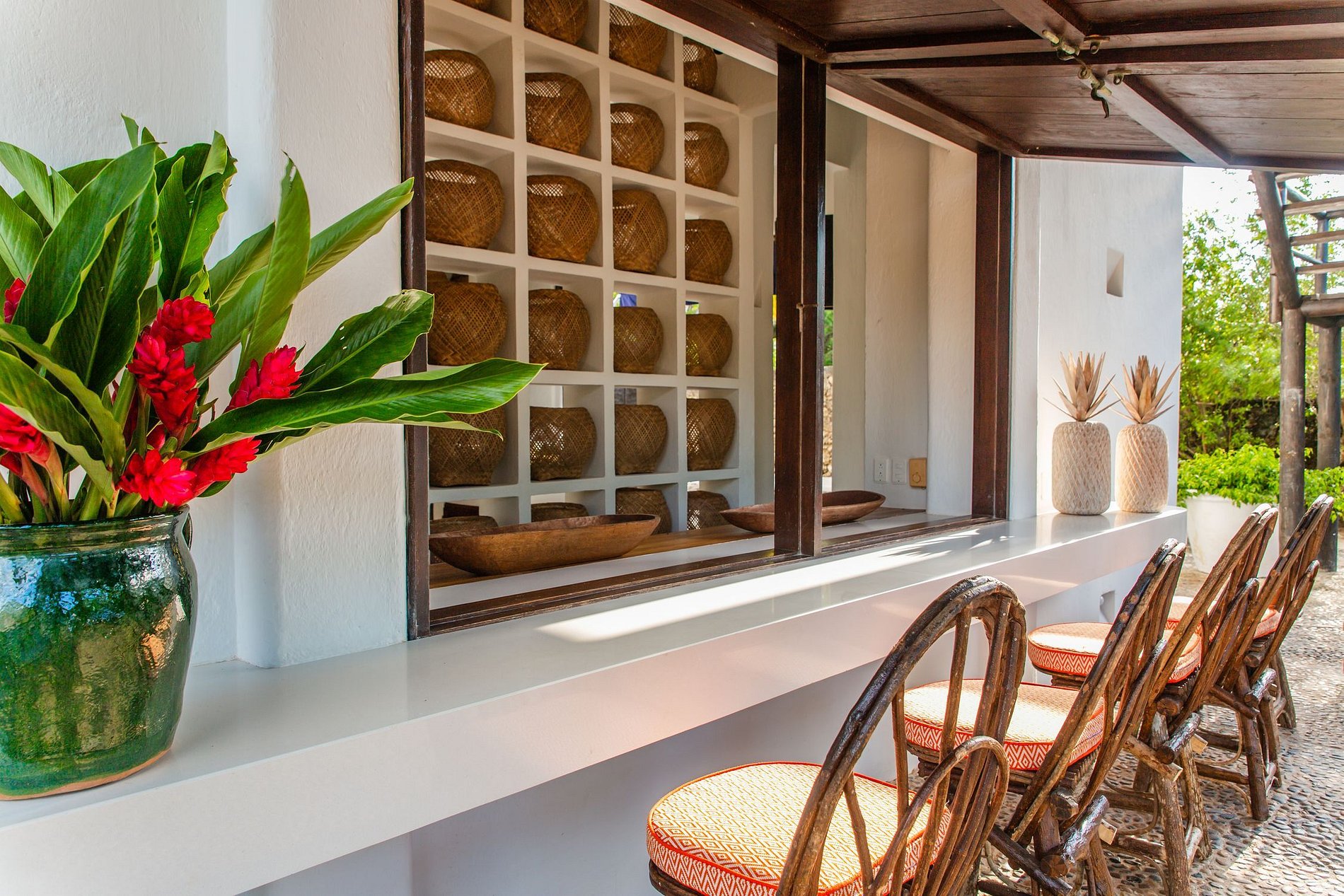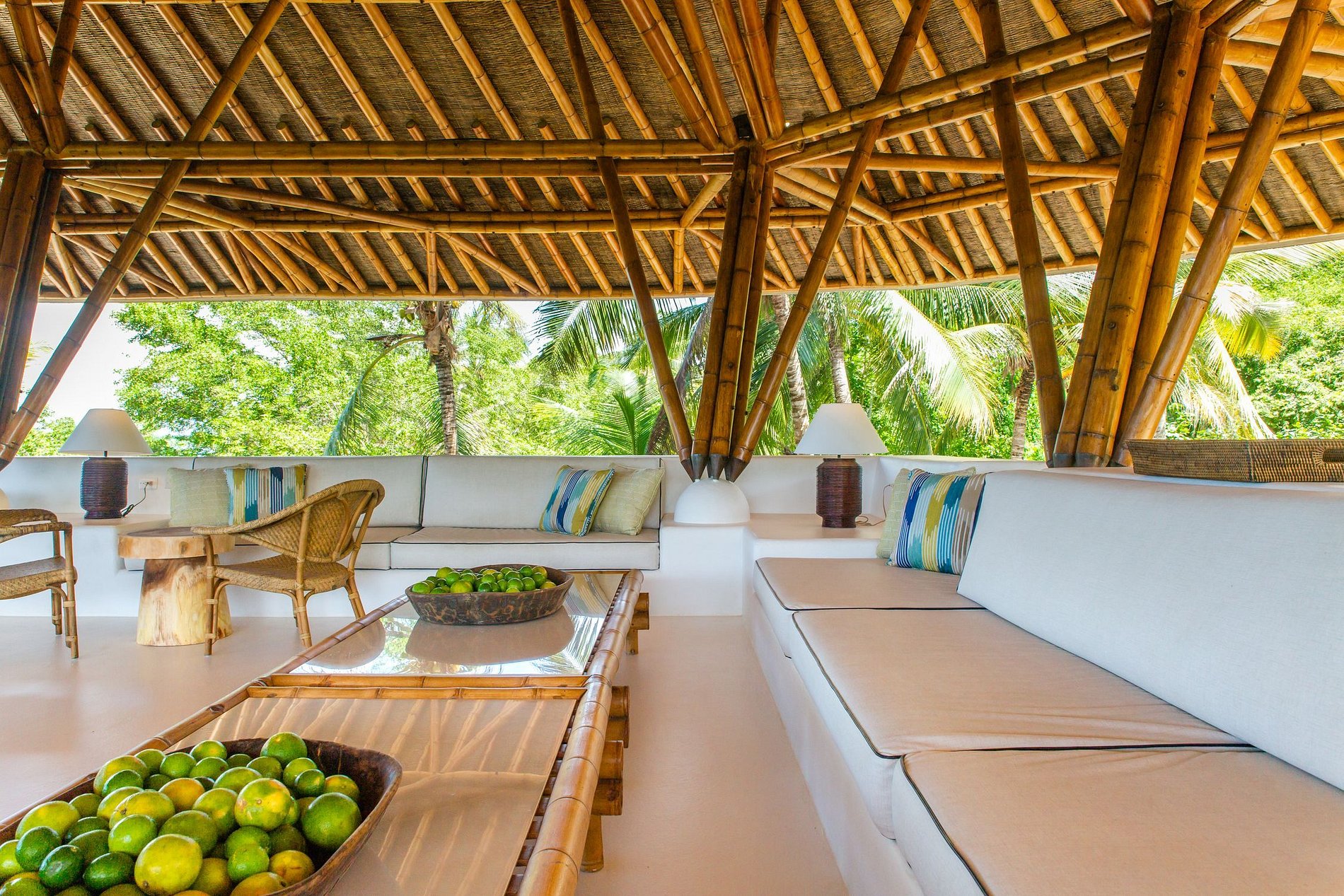 El primero es un bungalow que tiene 3 cuartos donde pueden dormir 8 personas cómodamente, una gran sala de estar amoblada en su mayoría con piezas de madera y sofás, y decorada con artesanías locales que complementan la belleza de la naturaleza circundante. El comedor es un espacio abierto con vistas al mar, y una hermosa mesa rústica de madera con capacidad para 8 personas.