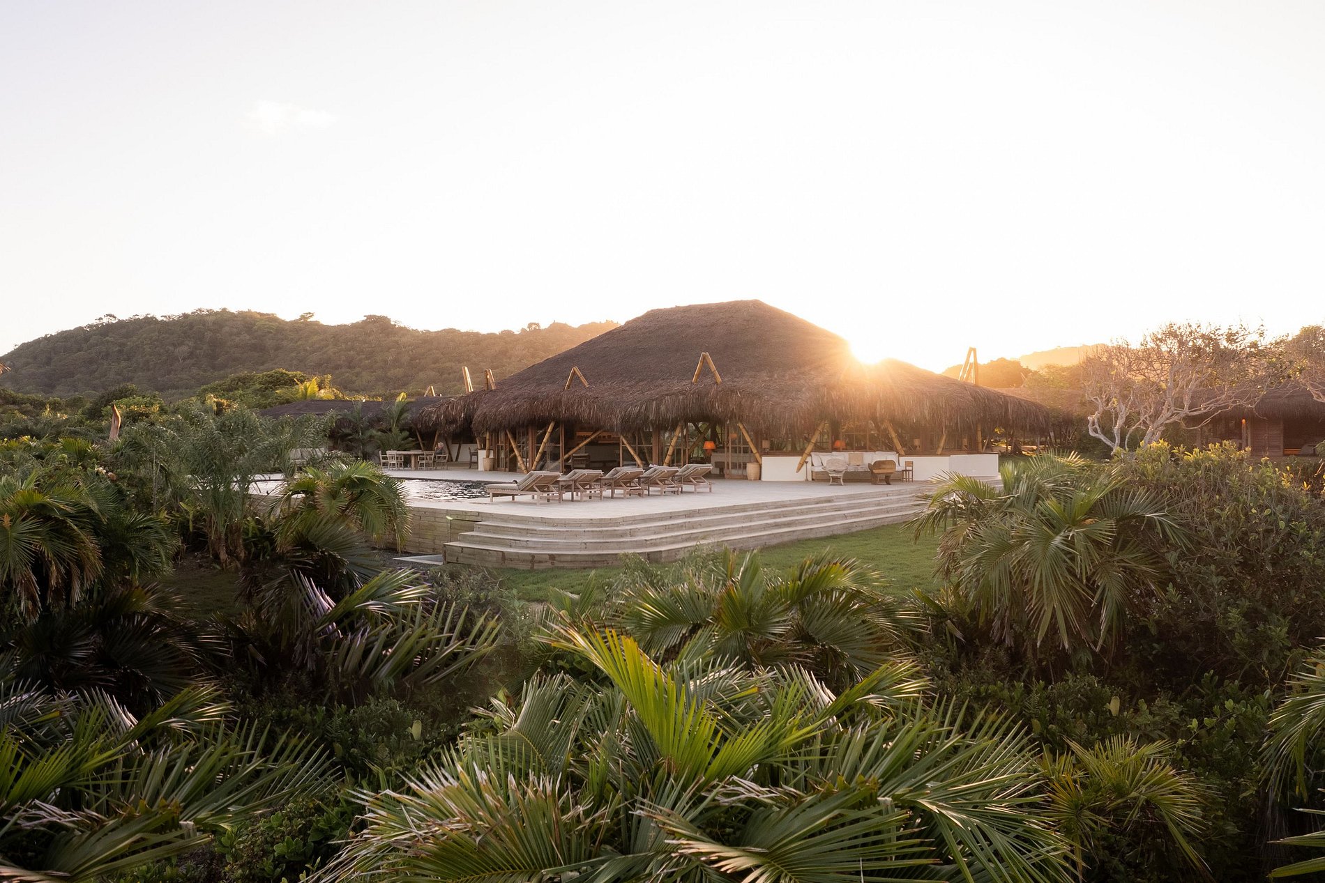 La sala principal es un espectacular hueco hecho de bambú y piasava, con un diseño abierto que fluye sin esfuerzo hacia una amplia terraza de madera, donde una piscina infinita ofrece impresionantes vistas al mar.