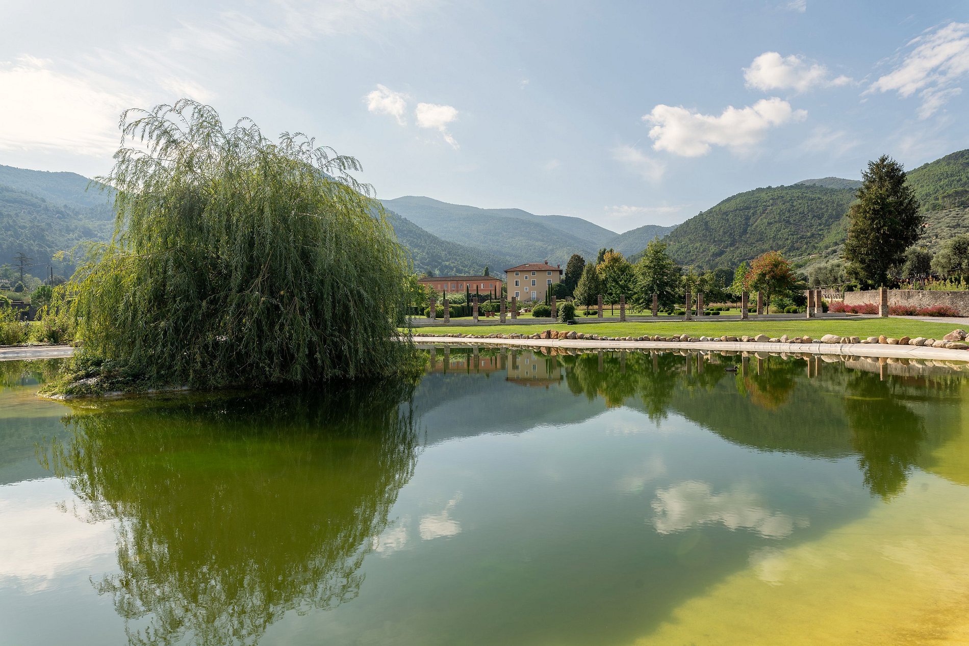 La villa cuenta con comodidades excepcionales, incluyendo dos hectáreas de terreno con piscina, un lago privado y diversas áreas de estar al aire libre, incluyendo jardines temáticos como el Jardín de Arte y el Jardín de Bodas. Además, la propiedad cultiva sus propios productos, como vegetales orgánicos, olivos para aceite de oliva extra virgen, una pérgola de kiwis y un huerto de limoneros.