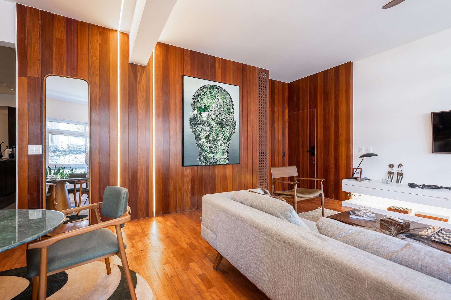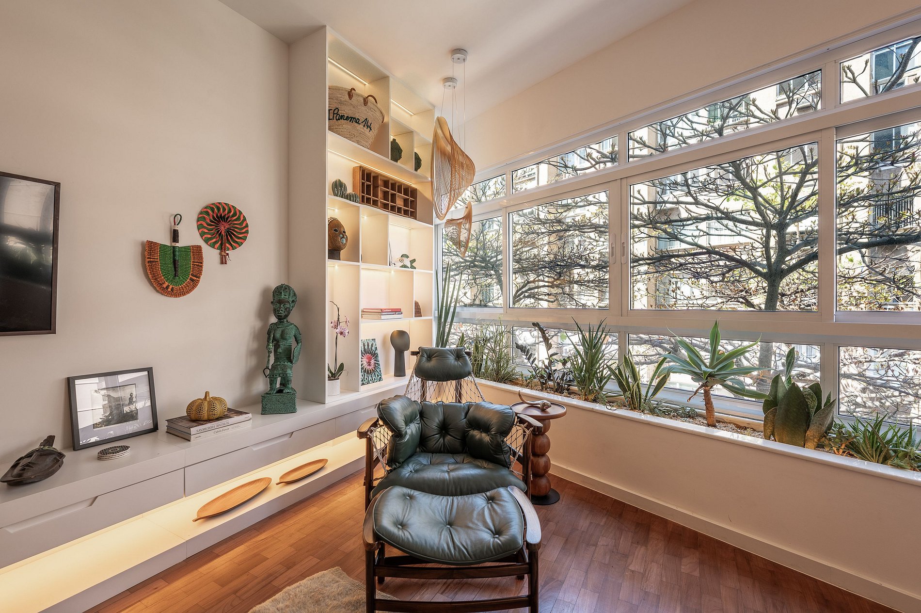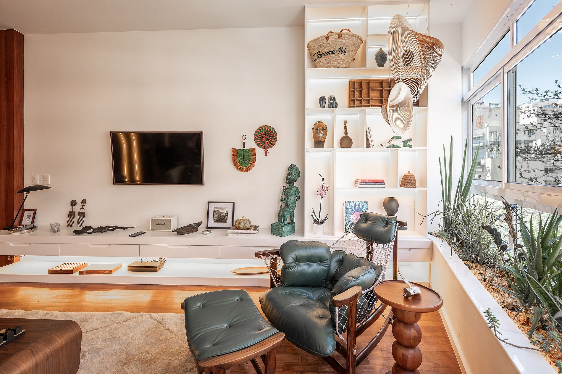 El apartamento cuenta con dos amplios dormitorios, cada uno con su propio baño privado, orientados hacia el patio interior para garantizar una tranquilidad absoluta. Las áreas sociales incluyen una sala de estar luminosa amueblada con piezas de diseñadores brasileños de los años 50, un elegante comedor y una cocina moderna totalmente equipada.