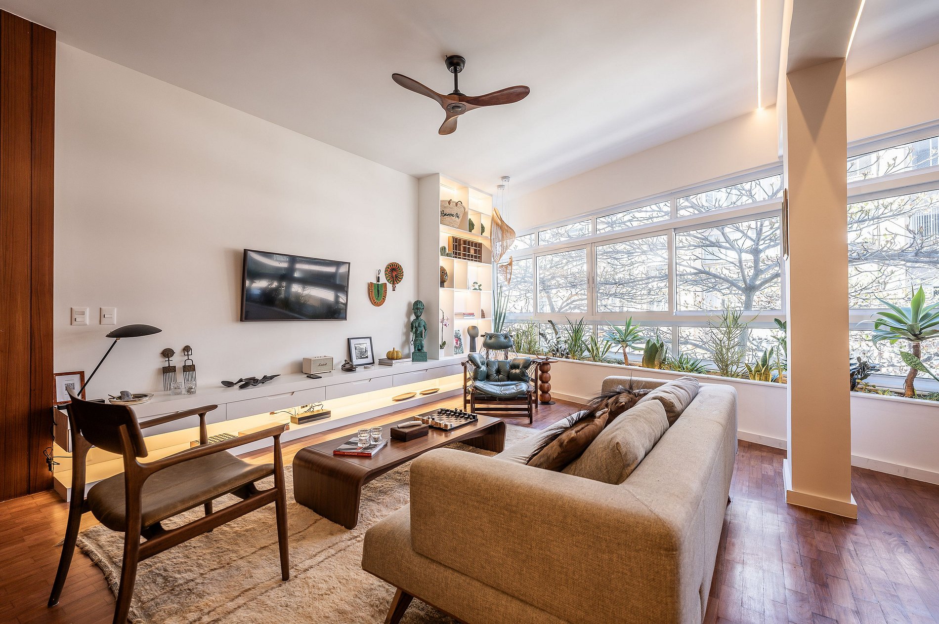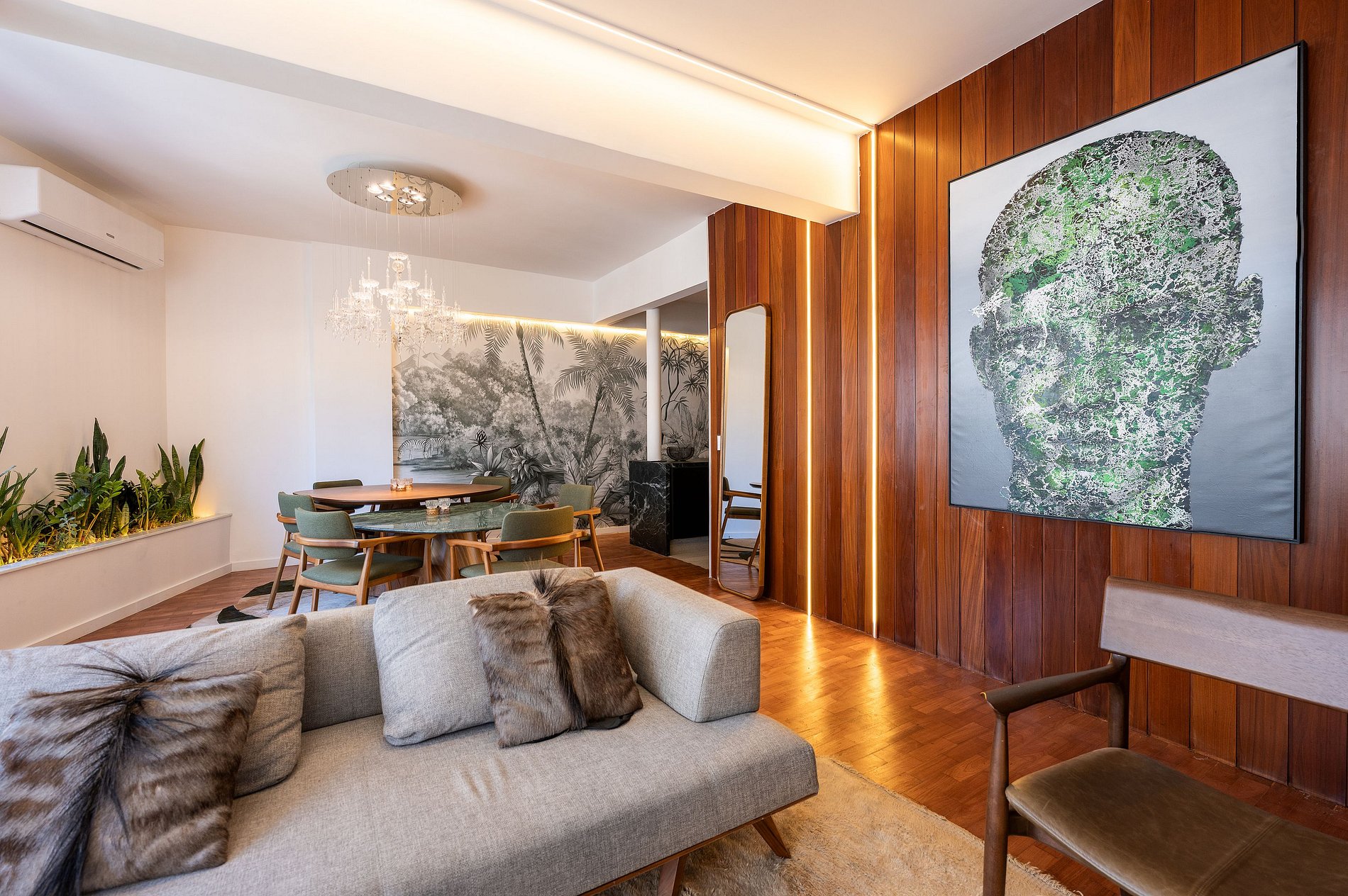 El apartamento cuenta con dos amplios dormitorios, cada uno con su propio baño privado, orientados hacia el patio interior para garantizar una tranquilidad absoluta. Las áreas sociales incluyen una sala de estar luminosa amueblada con piezas de diseñadores brasileños de los años 50, un elegante comedor y una cocina moderna totalmente equipada.