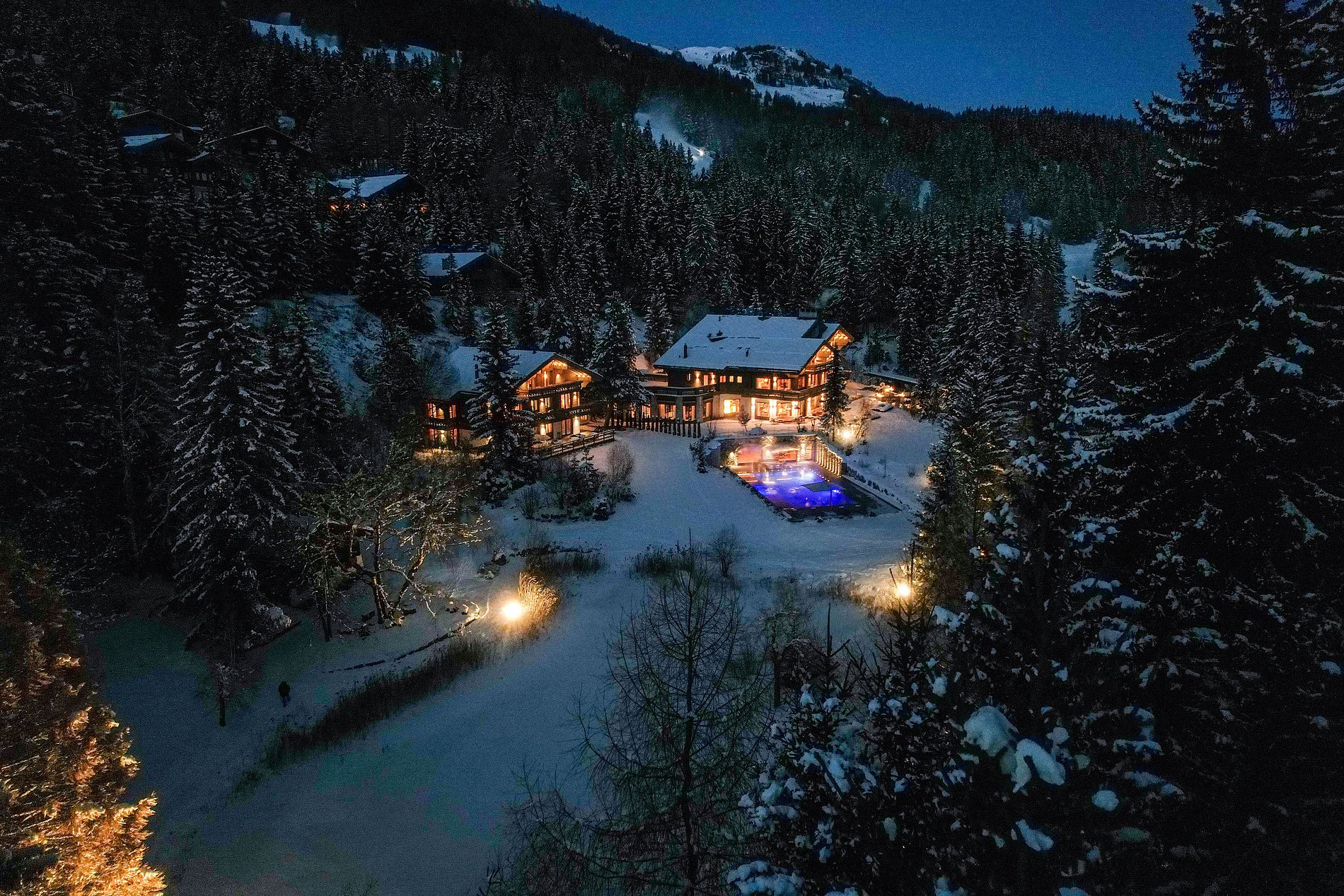 Dispone de dos chalets distintos que, en conjunto, pueden albergar hasta 38 invitados: el chalet principal cuenta con 16 adultos en 8 lujosas suites principales, cada una con su baño en suite y balcón, y 10 niños en dormitorios encantadores, con dos habitaciones con cinco camas individuales cada una, diseñadas como refugios llenos de encanto para los más jóvenes. El segundo chalet, más íntimo, ofrece 6 dormitorios amplios, cada uno con su área de vestidor, baño en suite y balcones privados, incluyendo una extensa cocina de diseño abierto, oficina y área de estar, lo que proporciona el equilibrio perfecto entre convivencia y privacidad.