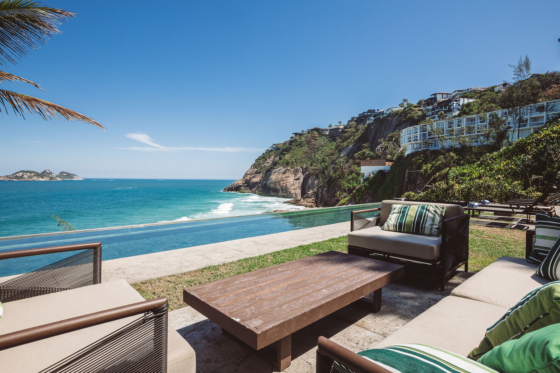 Desde la terraza o la piscina, los huéspedes disfrutan de una vista incomparable del océano Atlántico y de un acceso directo a la playa secreta de Joatinga, uno de los lugares más exclusivos y encantadores de Río.
