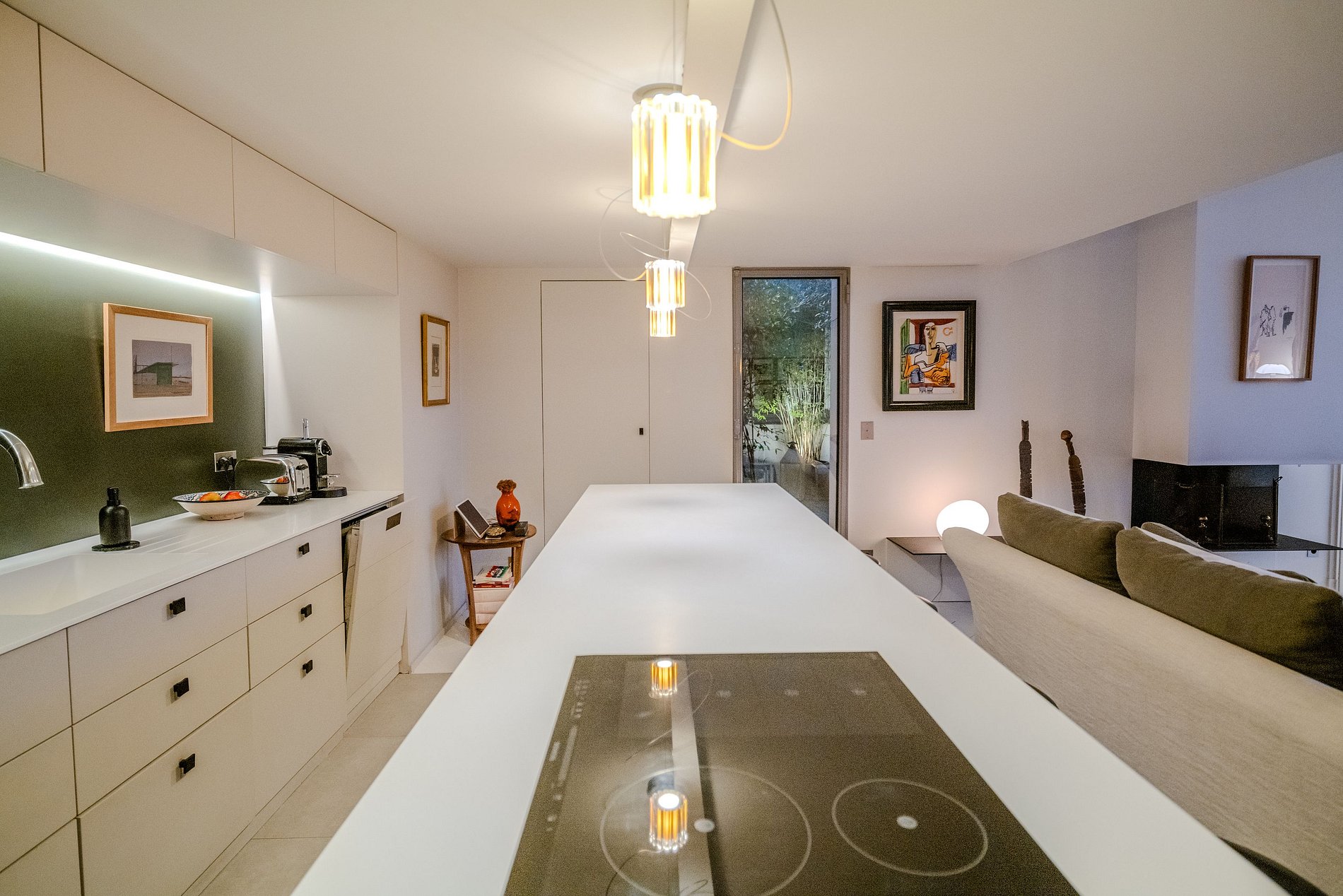 La cocina, una obra maestra del diseño moderno, se abre directamente al área de estar, permitiendo una interacción fluida entre cocinar y socializar. Está totalmente equipada con electrodomésticos de alta gama y ofrece un espacio elegante y funcional para aventuras culinarias.