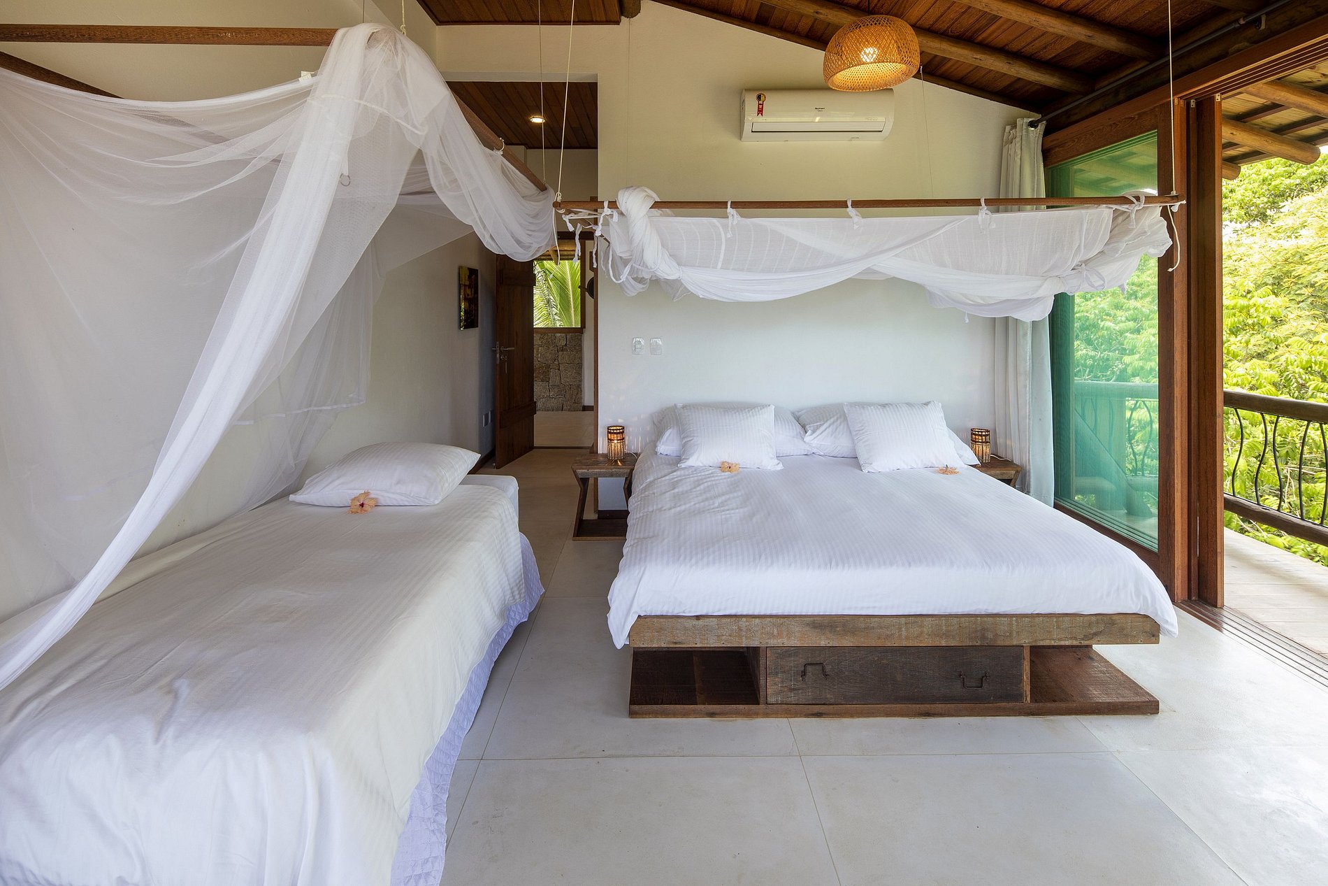 Suite principal: cama doble, aire acondicionado, balcón con vistas de 360º del bosque, la piscina, el río y el océano.