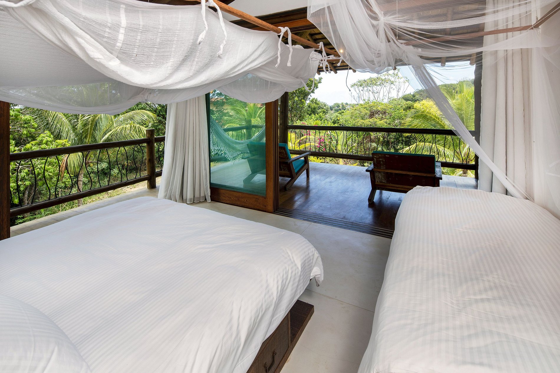 Suite principal: cama doble, aire acondicionado, balcón con vistas de 360º del bosque, la piscina, el río y el océano.