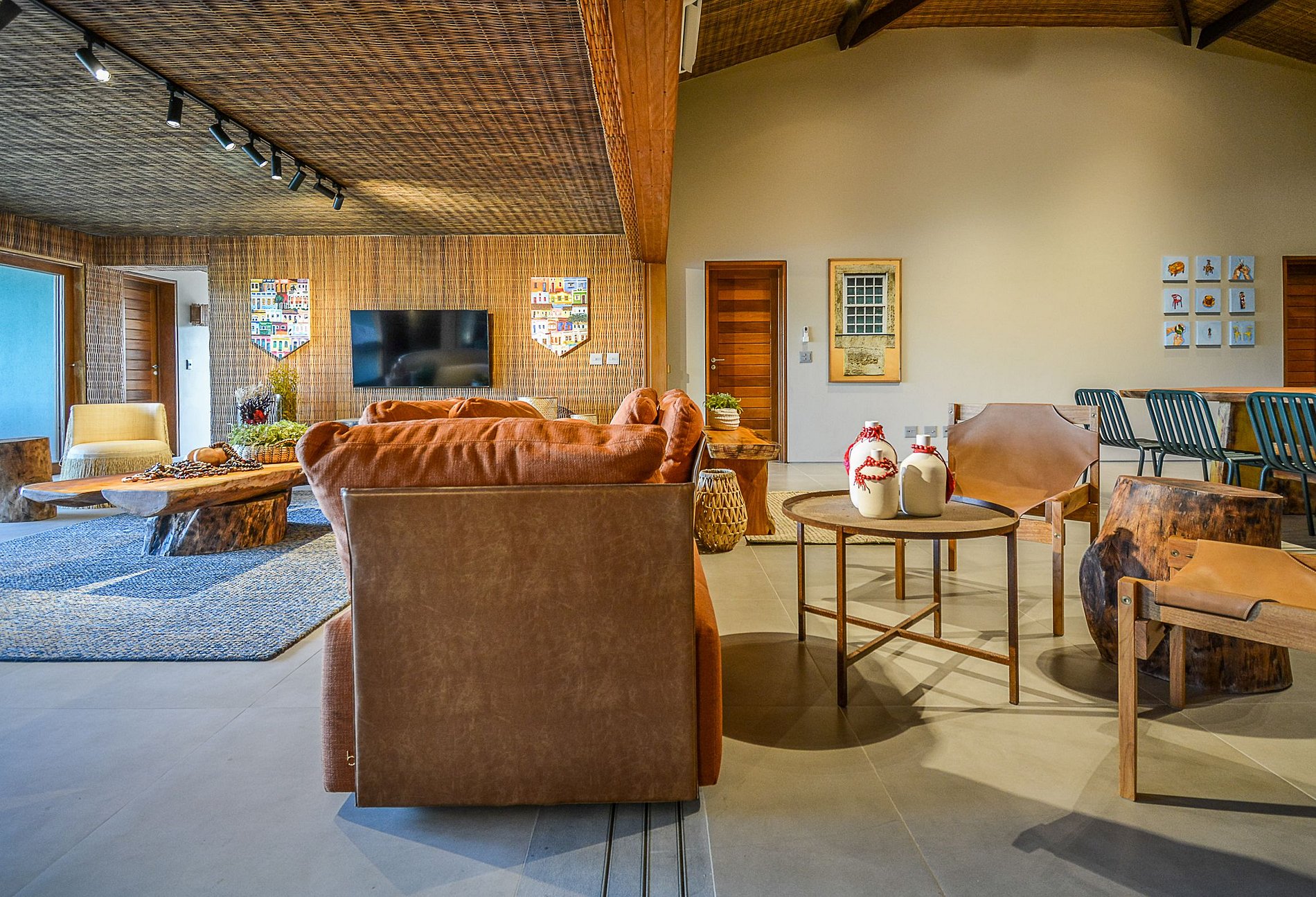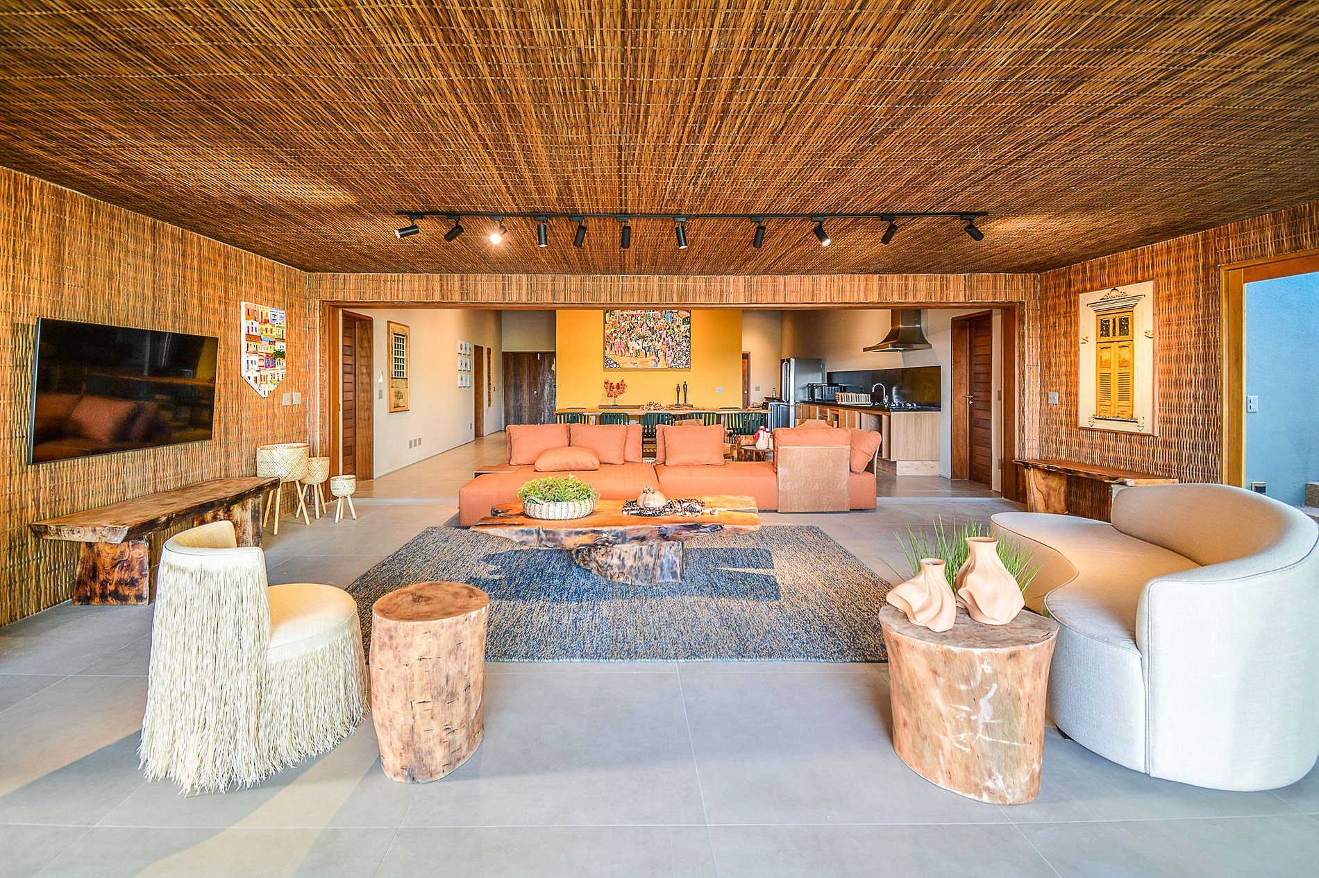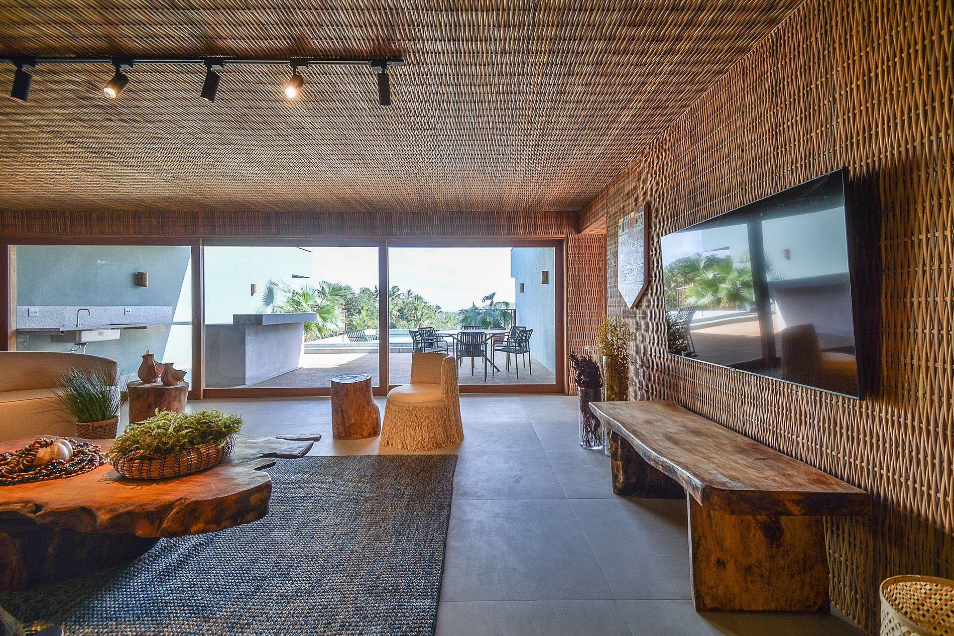 La sala de estar está bien iluminada de forma natural y presenta un llamativo diseño tropical, que utiliza fibra natural desde las paredes hasta el techo, con mucho refinamiento y lujo, además de un rico proyecto de iluminación artificial.