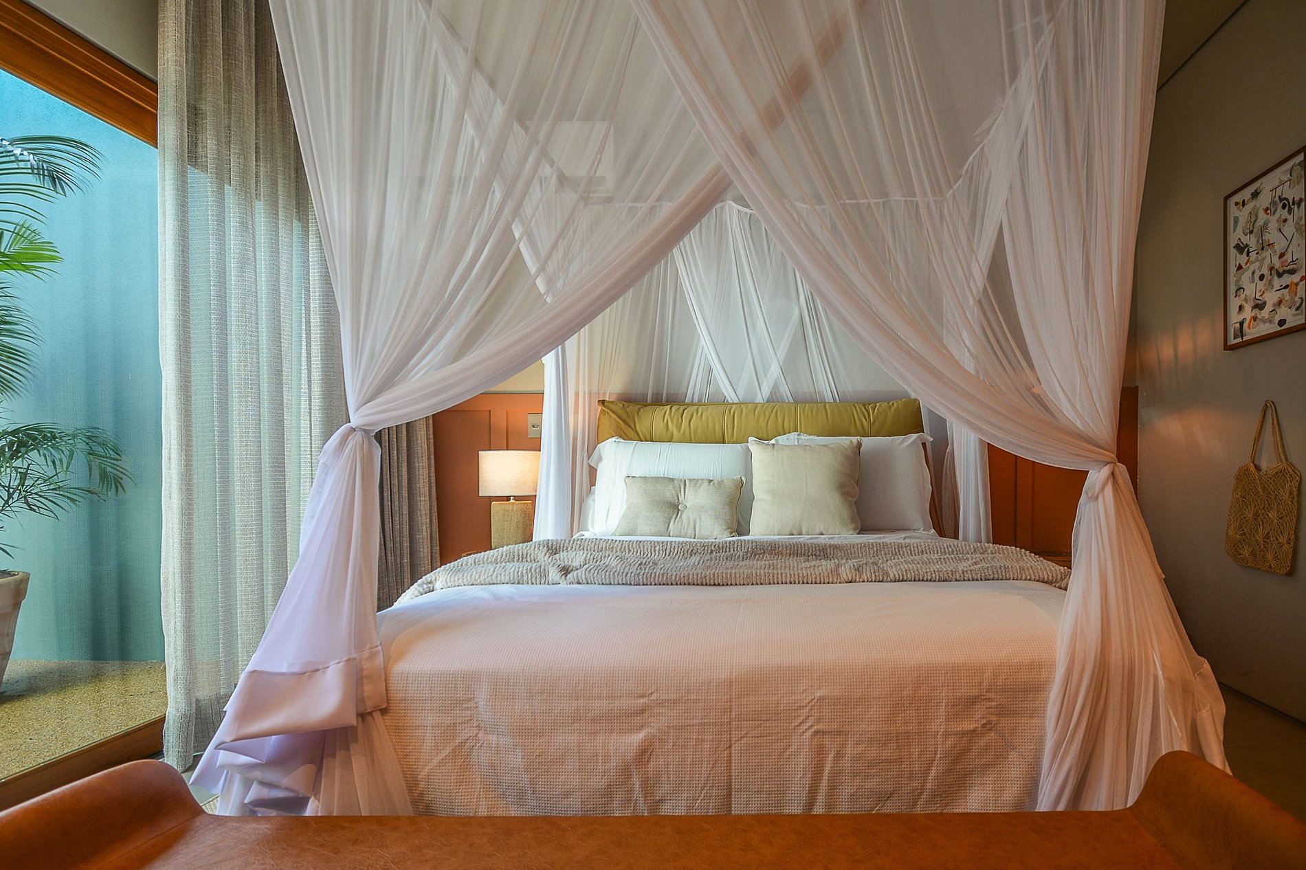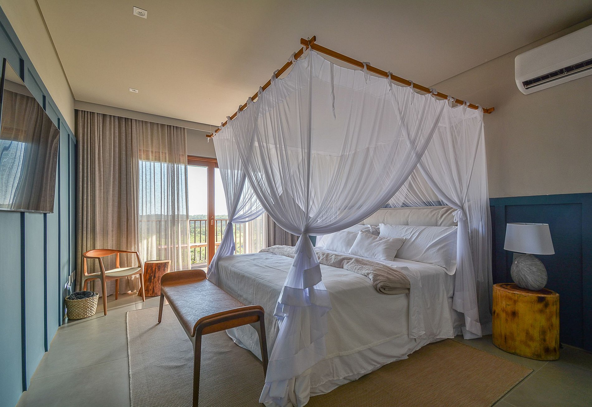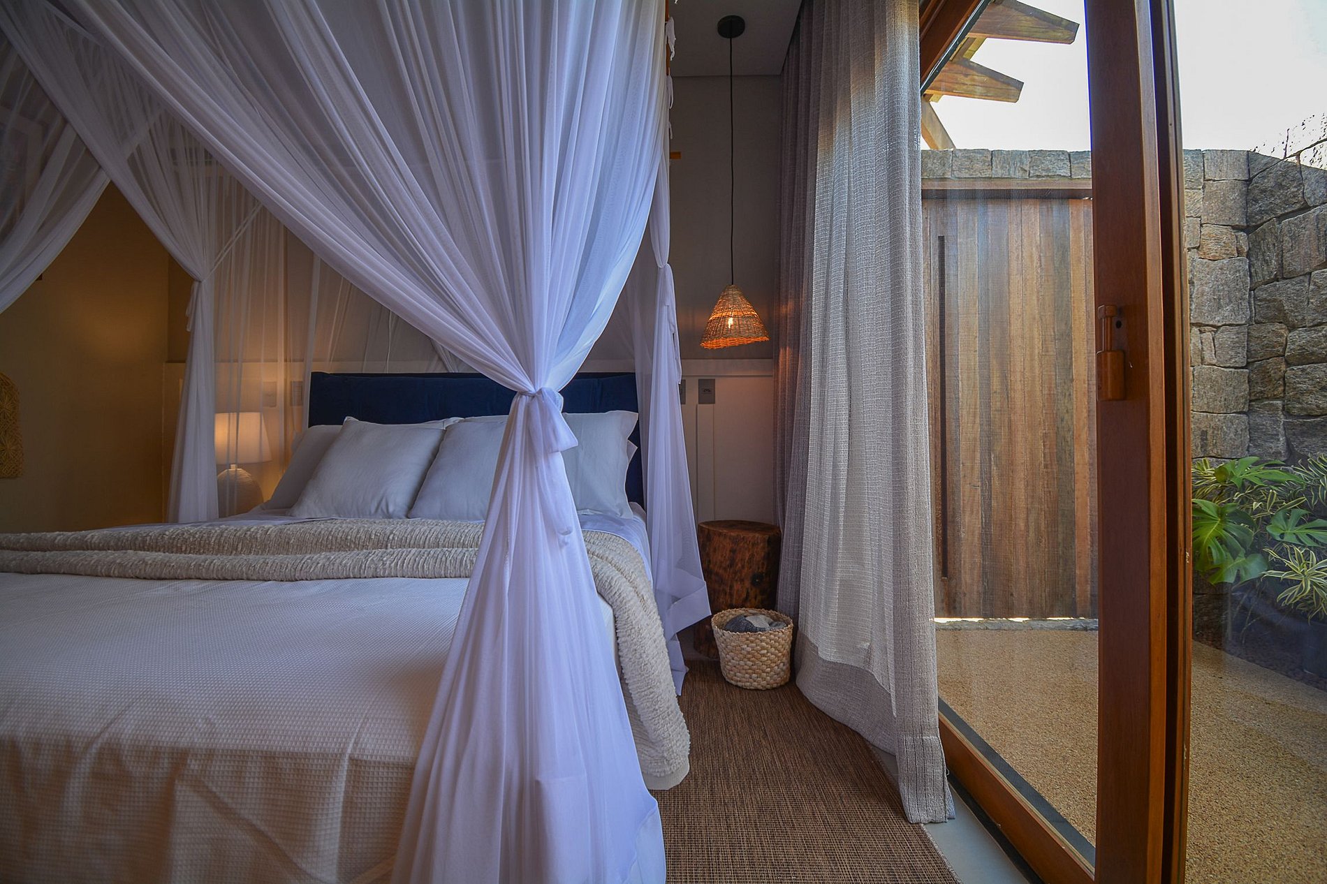 La sala de estar está bien iluminada de forma natural y presenta un llamativo diseño tropical, que utiliza fibra natural desde las paredes hasta el techo, con mucho refinamiento y lujo, además de un rico proyecto de iluminación artificial.