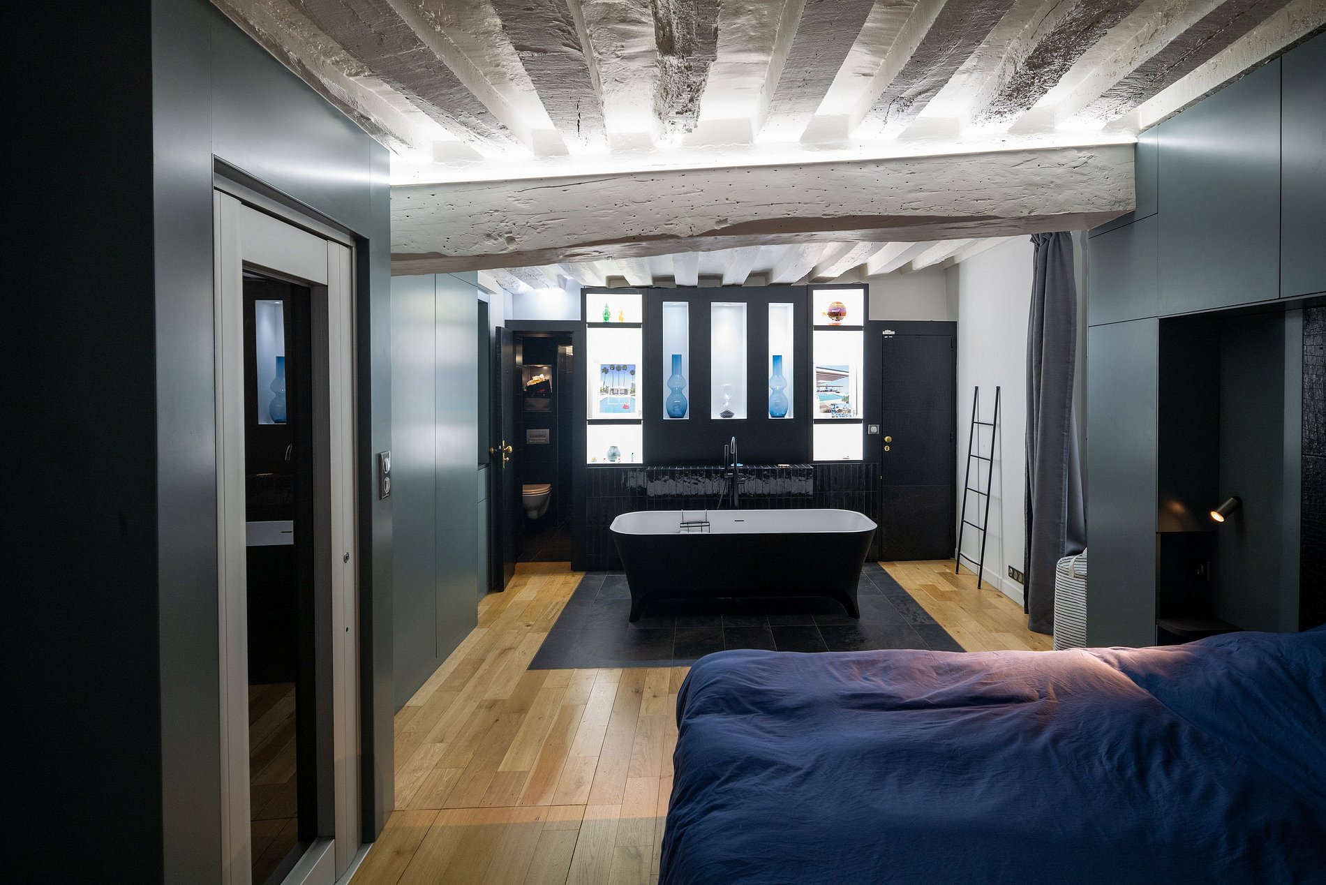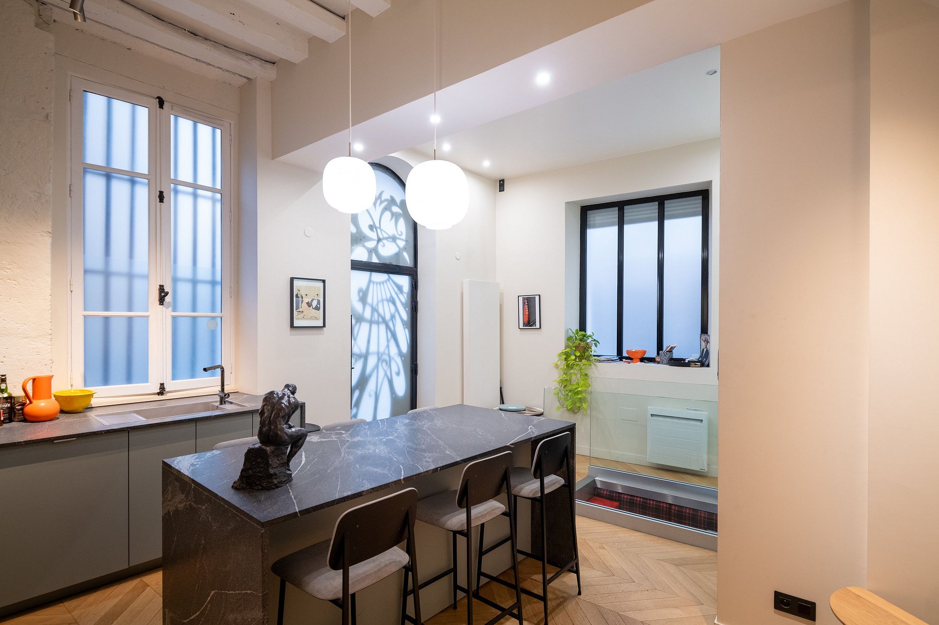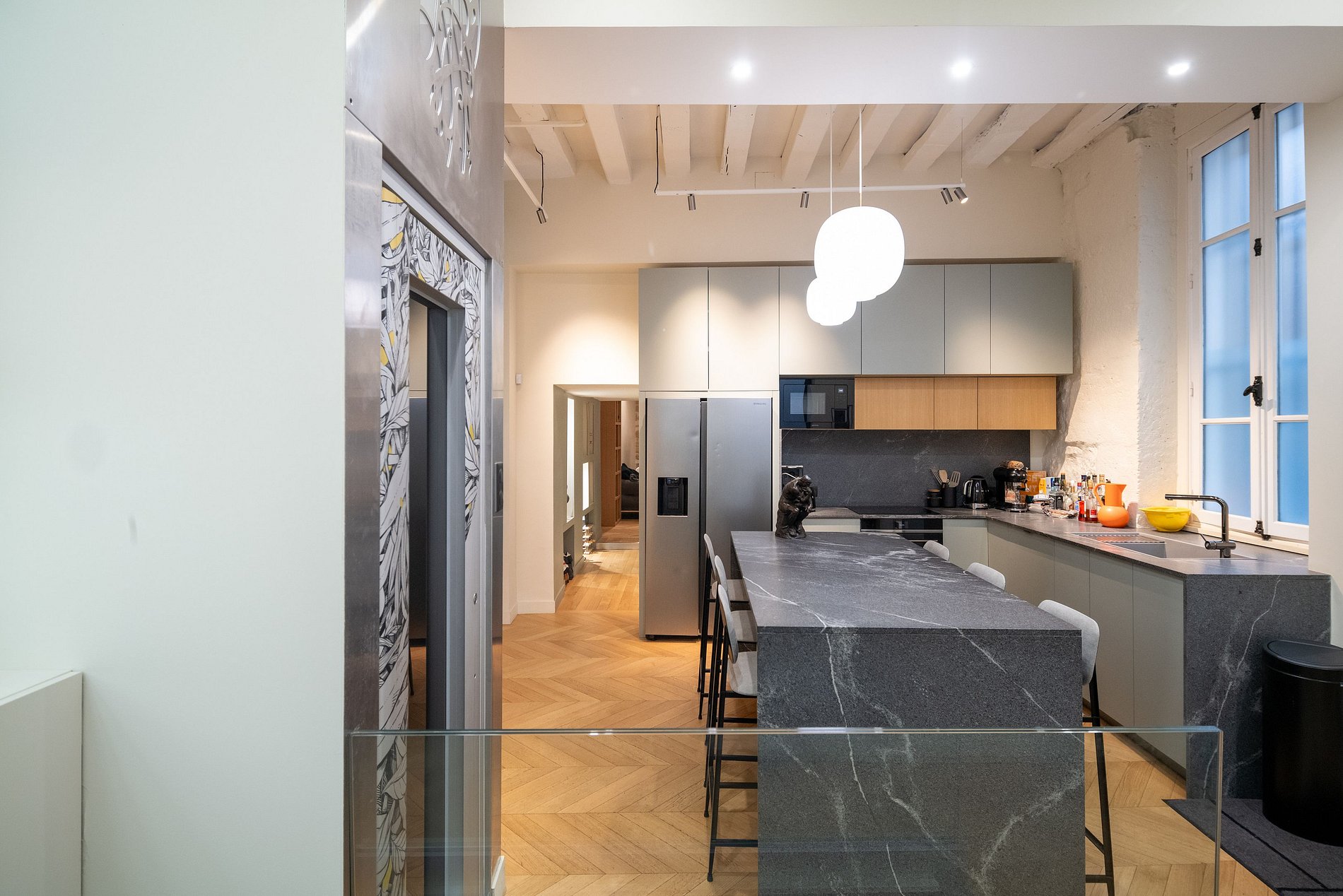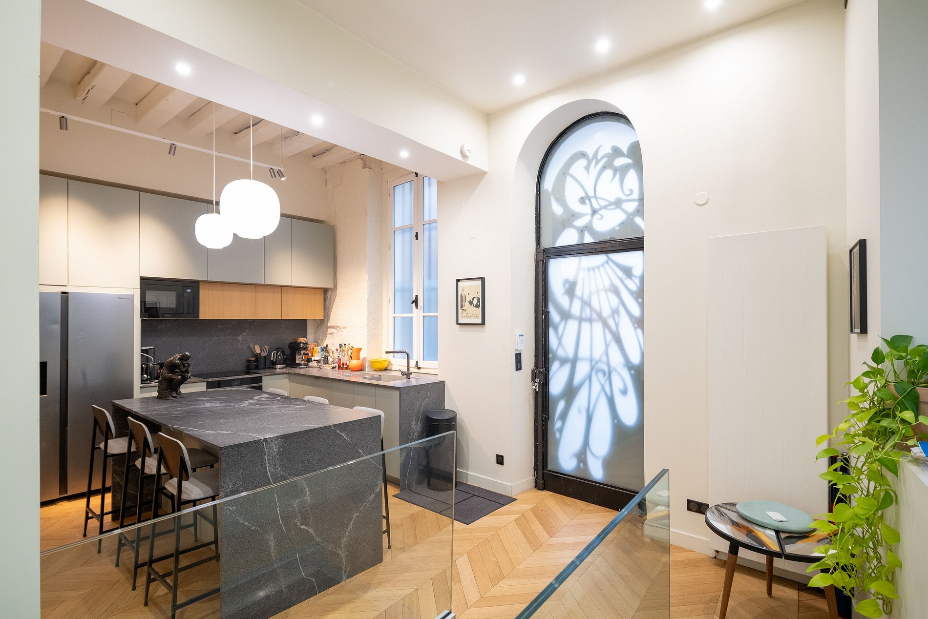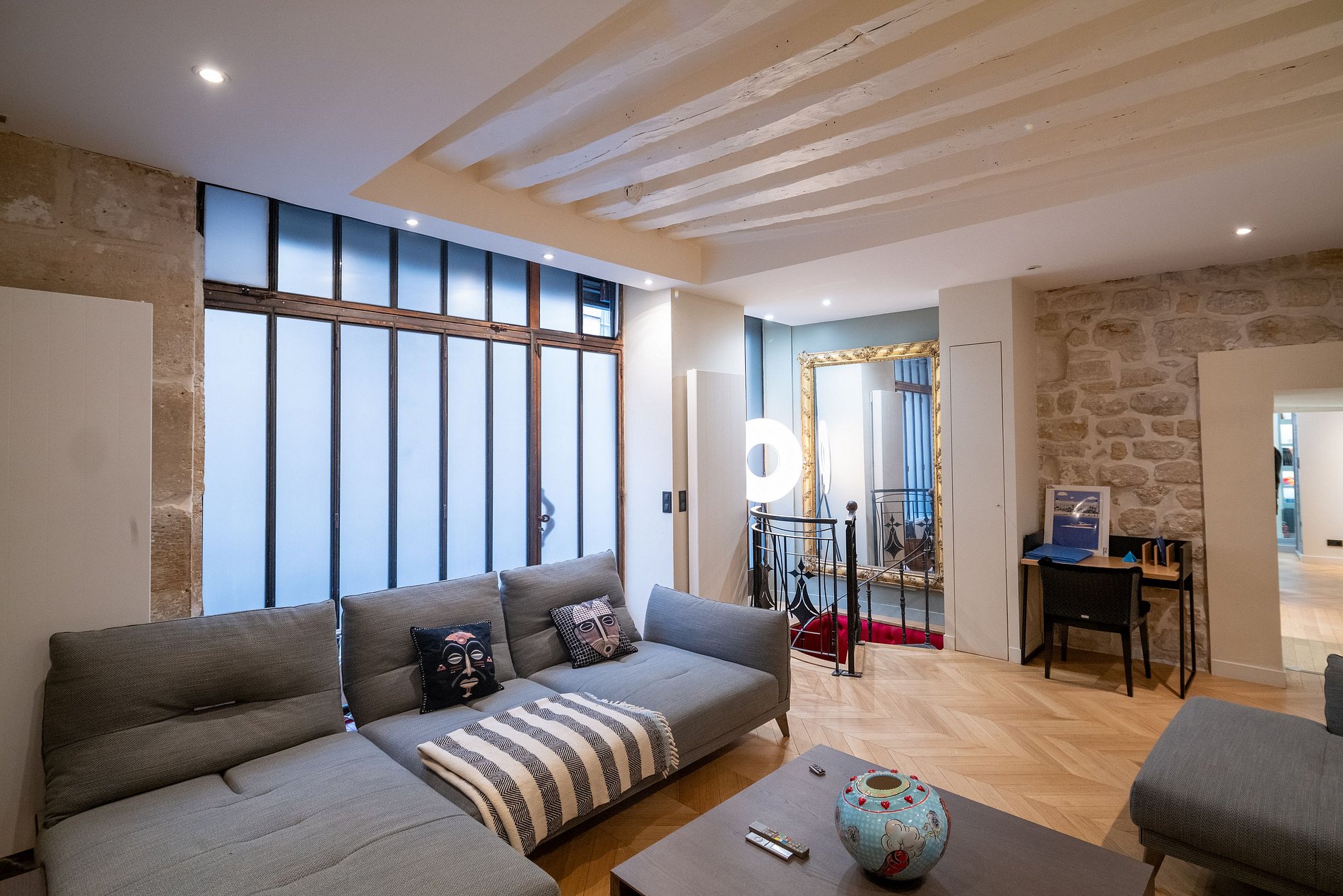 La planta baja presenta una deliciosa fusión de estilos rústicos y modernos. Las paredes de piedra original rinden homenaje a la rica historia de París, mientras que los elegantes muebles modernos añaden un toque de sofisticación. Este espacio acogedor, completo con una cocina de última generación, es perfecto para entretenerse y relajarse.