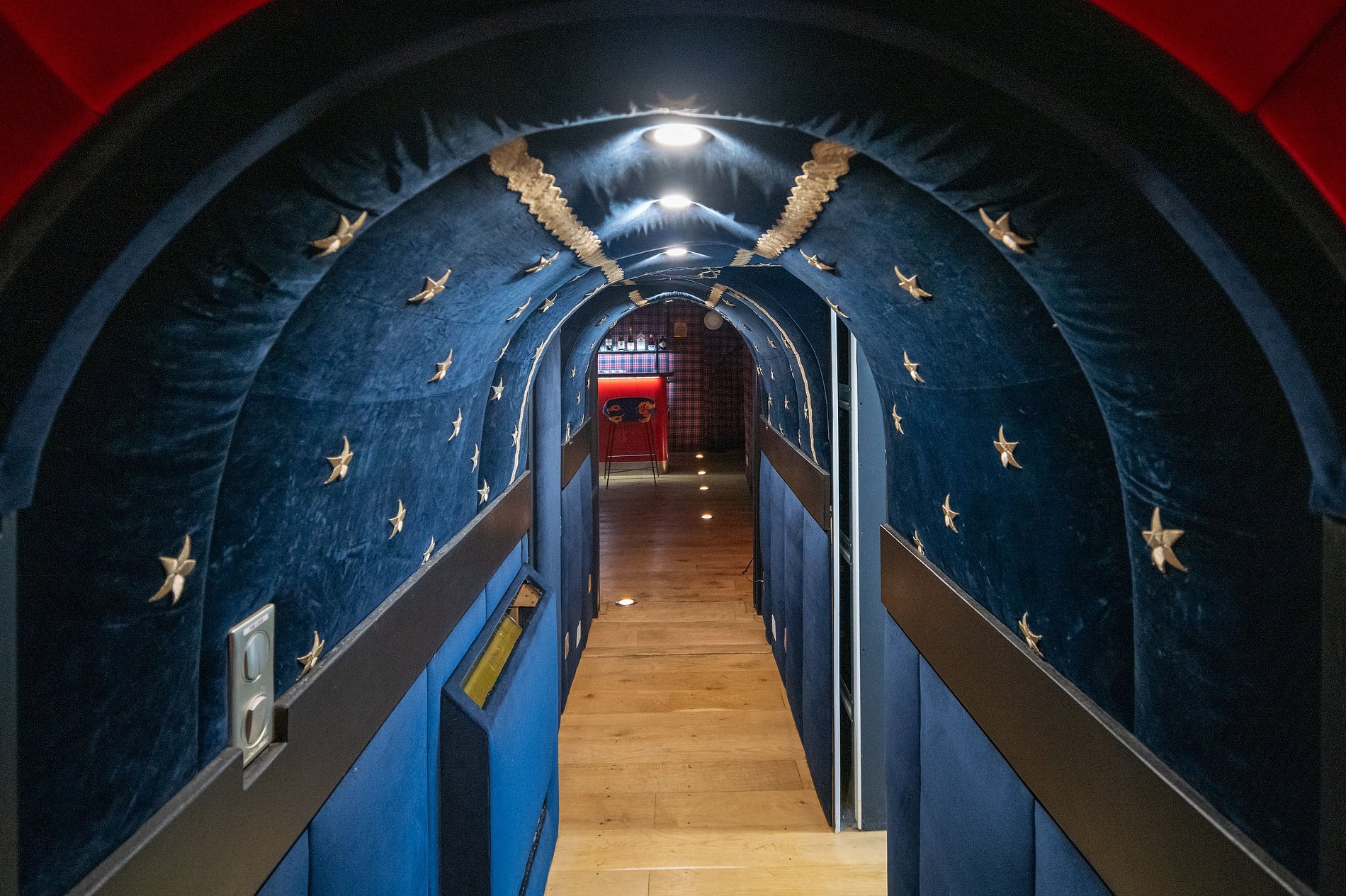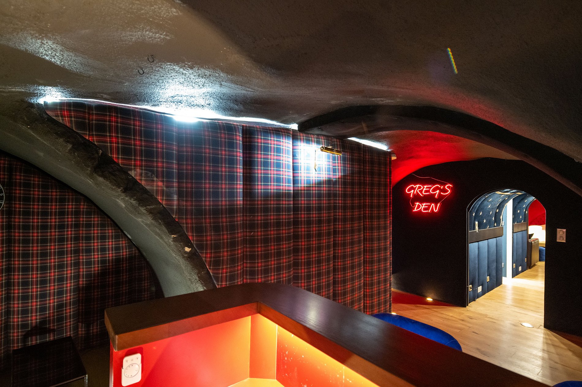 Sin embargo, el nivel del sótano se transforma en un espacio supremo de entretenimiento y ocio. Cuenta con una elegante área de bar, una pista de baile dedicada y dianas para diversión atractiva. Añadiendo al encanto, una cama grande y suntuosamente amueblada sirve como un espacio versátil, insinuando una relajación aventurera e indulgencias juguetonas, perfectas para el disfrute después de horas o como un espacio de huéspedes no convencional.