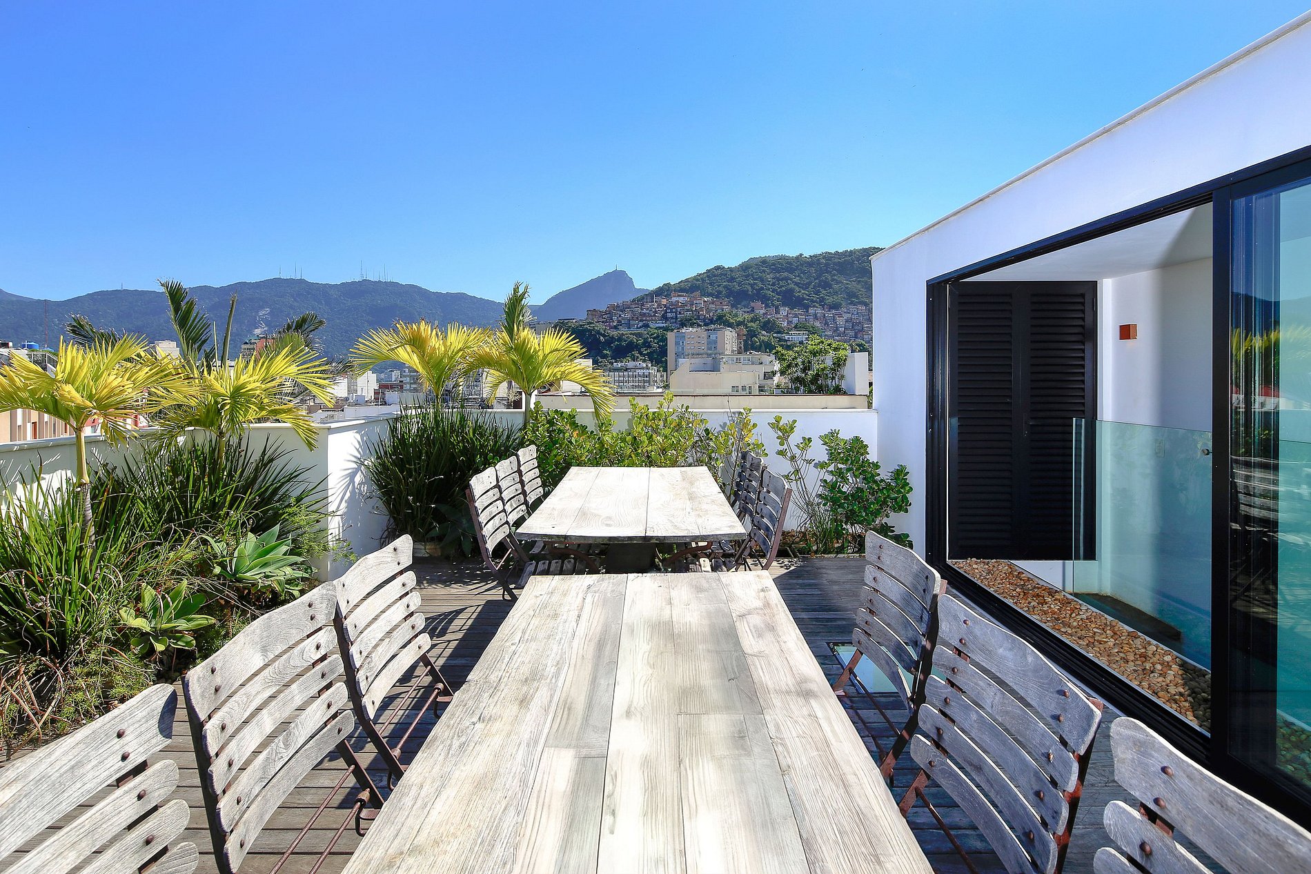 La terraza cuenta con una piscina equipada con sistema de nado contracorriente, amplias áreas sociales y un ambiente que transmite inmediatamente la esencia auténtica de Río.