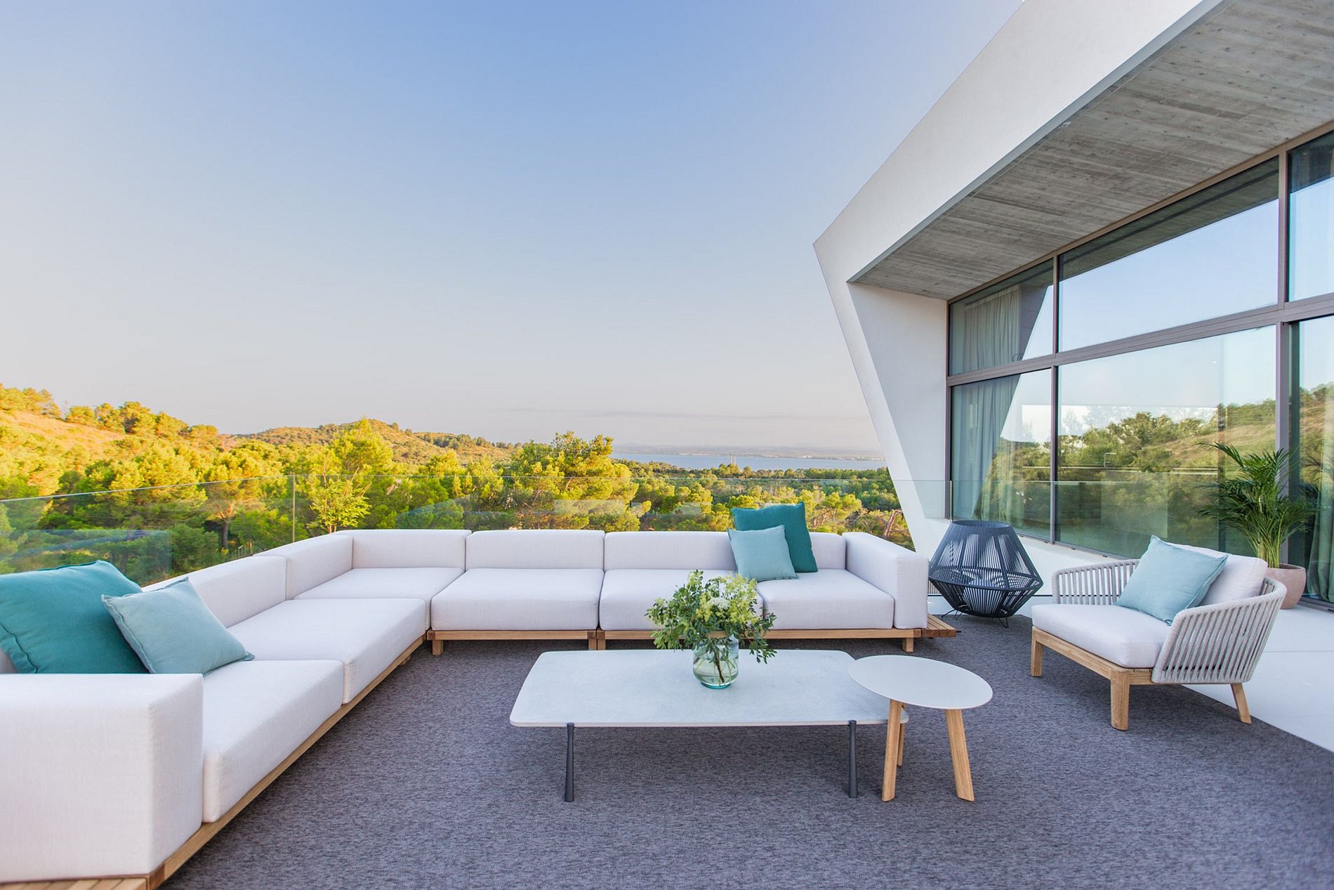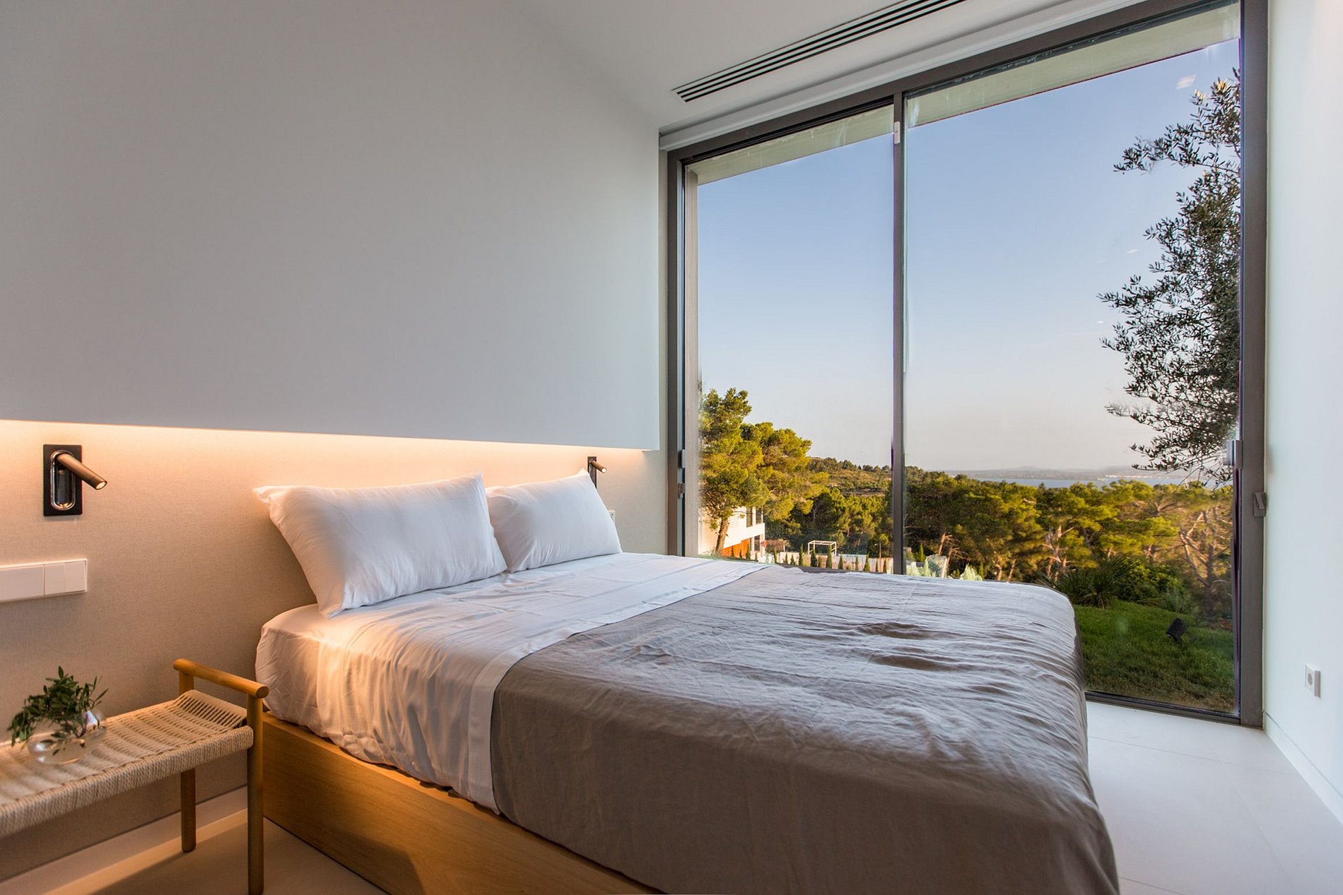 Arriba está la cocina/sala de estar de planta abierta con ventanas panorámicas, la acogedora sala de estar con chimenea de gas y la terraza con piscina Jazzuzzi. La villa también tiene un ascensor y un sauna interno.