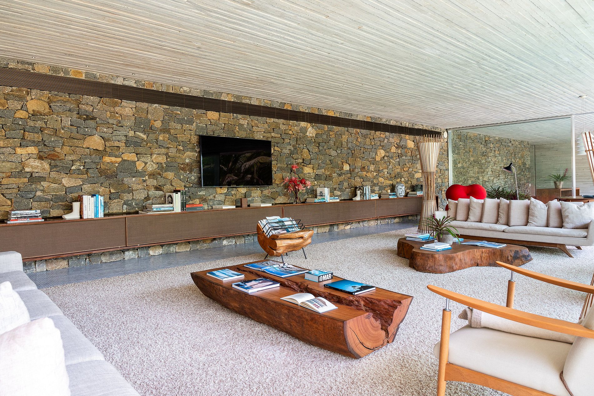 • Suite 5: Con una cama queen-size, esta suite tiene armarios independientes y un patio exterior con vistas al bosque, ofreciendo total privacidad. El patio está decorado con piedras naturales y tumbonas de Sérgio Rodrigues, creando un refugio de paz y comodidad.