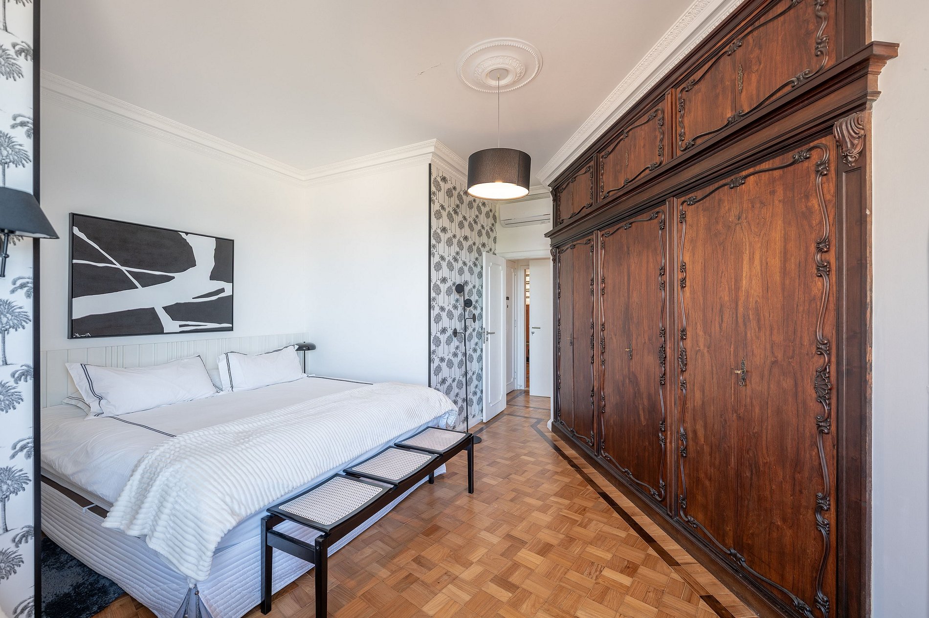 La propiedad cuenta con cuatro dormitorios, incluida una suite, todos preparados para garantizar máximo confort y privacidad. Los interiores siguen una línea estética sofisticada, con tonos neutros, madera clara y piezas decorativas seleccionadas para crear un entorno equilibrado y acogedor. La suite principal disfruta de una vista privilegiada, permitiendo que el horizonte de Copacabana esté presente desde el amanecer.