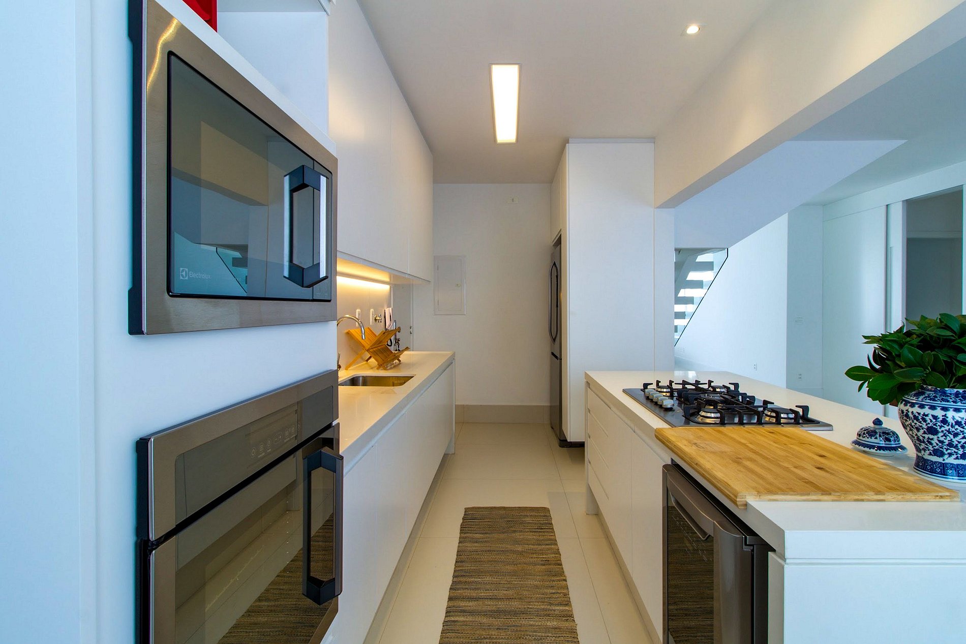 La cocina es moderna, con hornos empotrados, vitrocerámica de acero inoxidable, menaje básico, sartenes, vajilla y lavavajillas para facilitar el trabajo en la cocina.