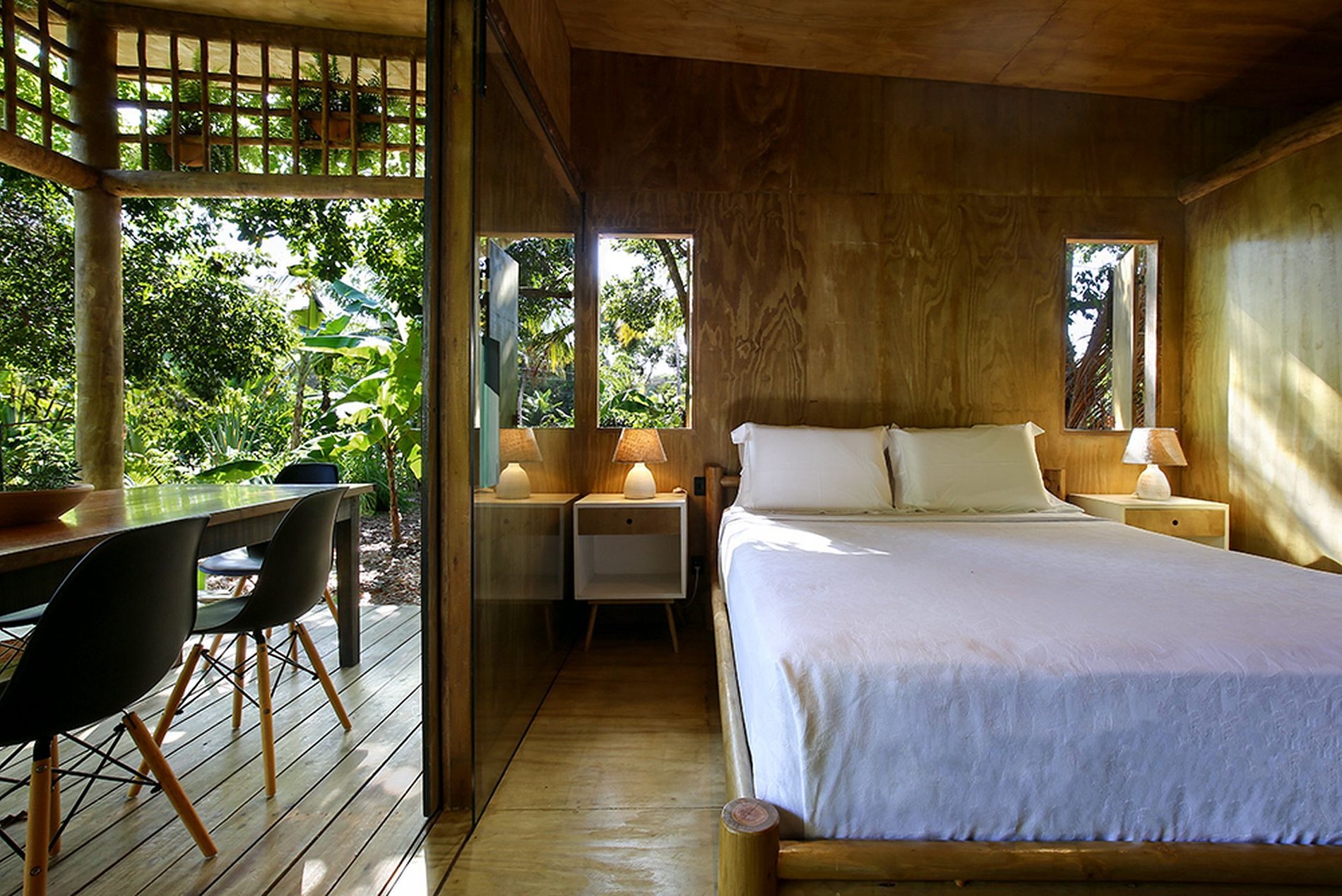 La villa cuenta con un jardín lleno de árboles y plantas autóctonas, lo suficientemente espacioso para albergar a niños pequeños, con hamacas para descansar y chimenea. Su balcón tiene un deck de madera y está amueblado con sofás y mesas para comer al aire libre. Se divide en dos lofts, el primero para 1 pareja y el segundo para una familia de 4 o 2 parejas de amigos.