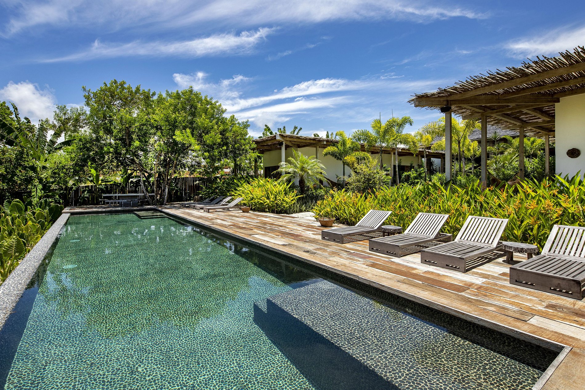 Las vastas áreas sociales abarcan un lujoso jardín tropical que conduce sensualmente a una piscina infinita abierta en la jungla.