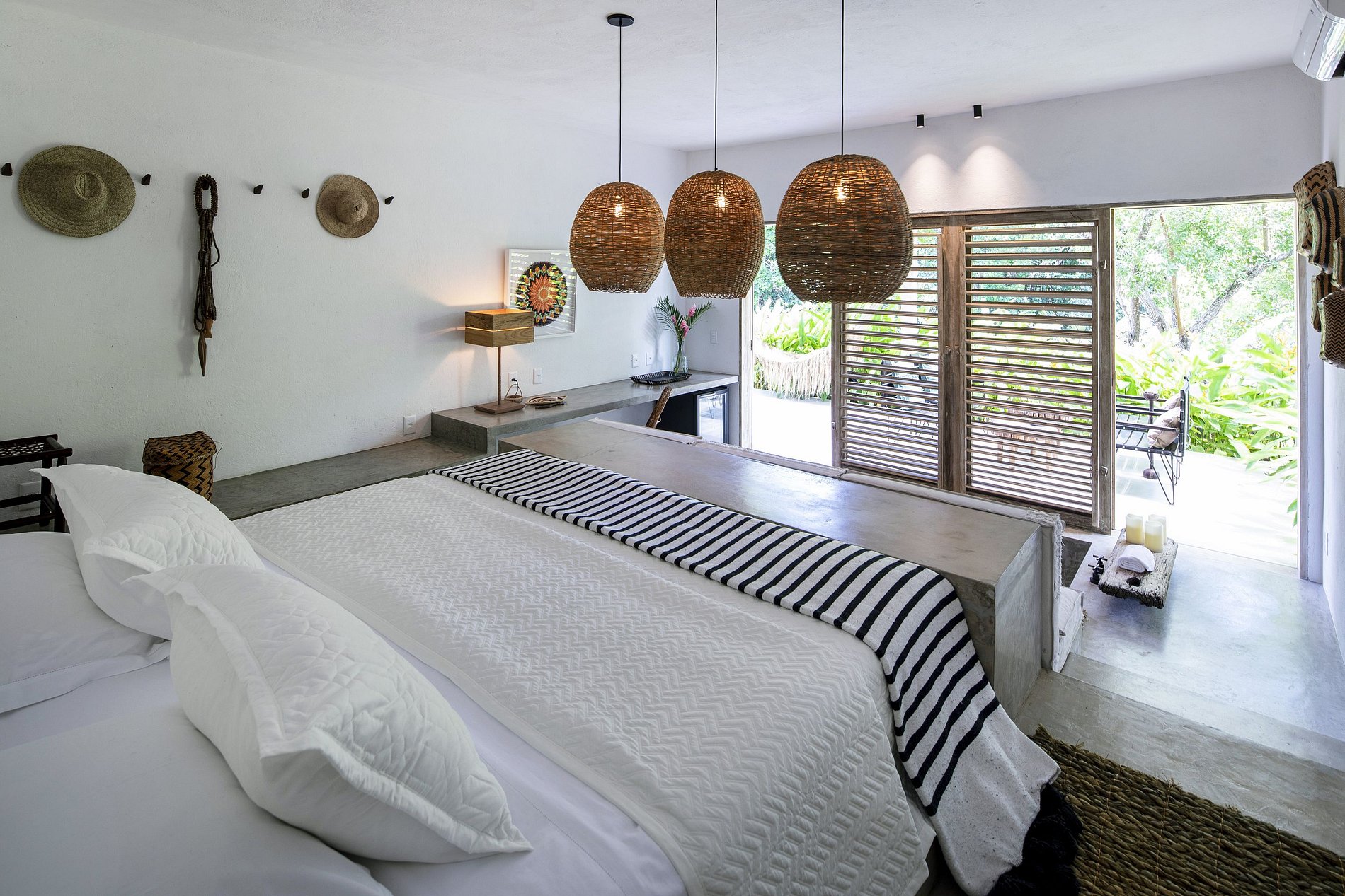 Suite 3: Cama king size, aire acondicionado, mesa empotrada, balcón con vista a la piscina y al jardín