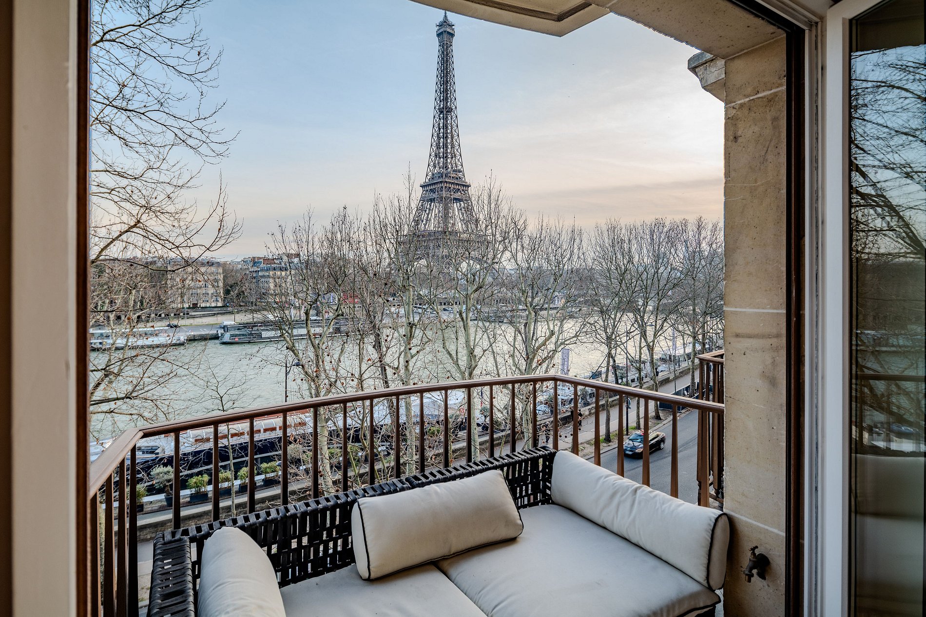 Lo que lo distingue son las únicas adiciones de dos pequeñas terrazas, cada una ofreciendo su encanto y propósito distintos. La primera terraza está dedicada a la relajación y el ocio, diseñada como un salón al aire libre donde uno puede relajarse y sumergirse en el entorno sereno. La segunda terraza es un espacio encantador con una mesa y dos sillas, perfectamente posicionadas para ofrecer vistas directas de la majestuosa Torre Eiffel y del tranquilo río Sena. Estas terrazas brindan una oportunidad rara de disfrutar de la belleza icónica de París en un entorno privado e íntimo.