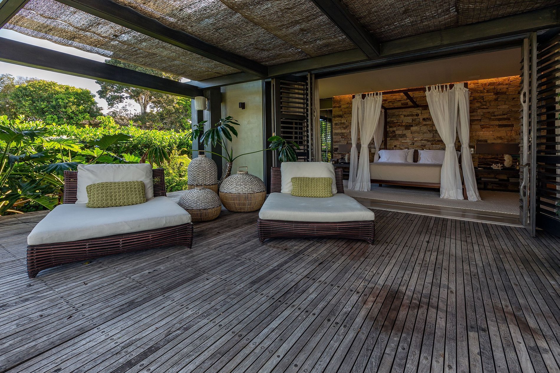 El exterior tiene un hermoso jardín y hamacas. El deck cuenta con cómodas asoleadoras y sombrillas para tomar el sol o descansar disfrutando de la hermosa vista del entorno. La casa dispone de barbacoa de gas móvil de kitchenaid, para preparar la barbacoa tanto en el interior como en el jardín de la villa.