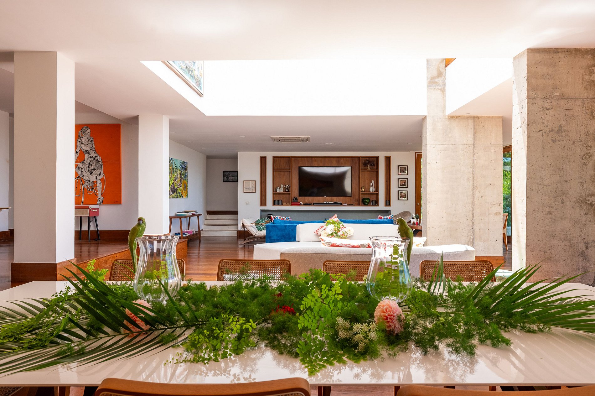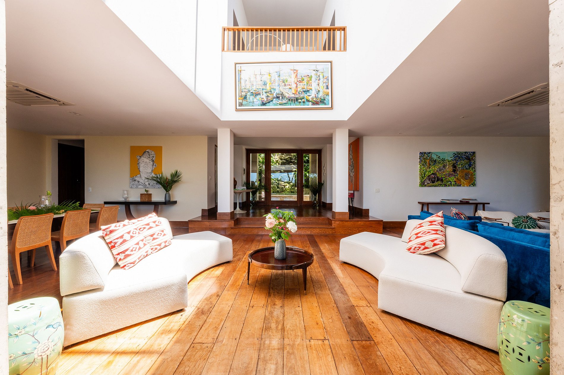 Diseñada para estancias inolvidables en familia o con amigos, la villa cuenta con amplios espacios interiores y exteriores, llenos de luz natural e integrados con terrazas y áreas de descanso. La entrada principal da acceso a un gran salón abierto hacia el exterior, conectado directamente con la terraza principal y la preciosa piscina—ideal para disfrutar del clima de Río.