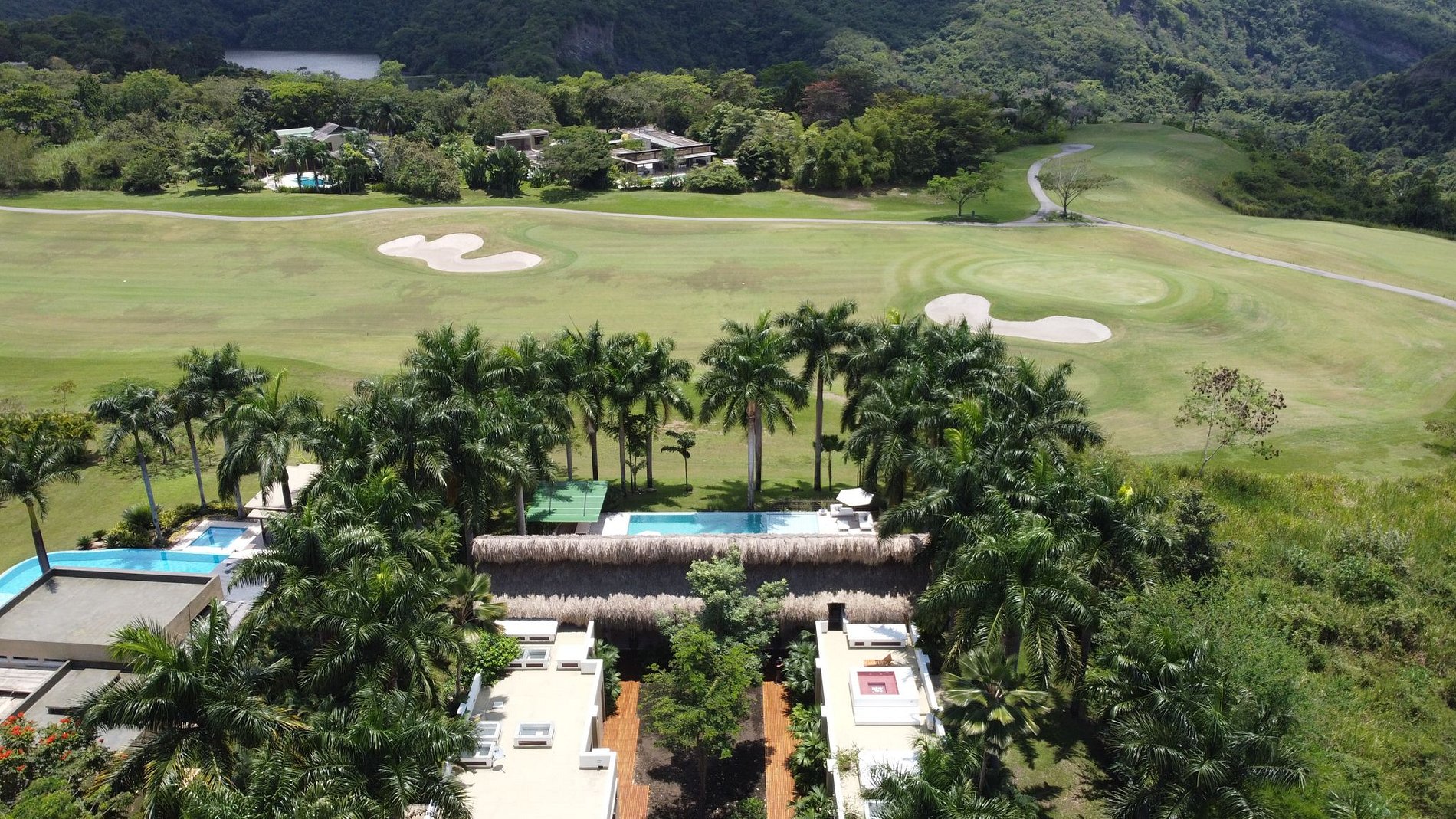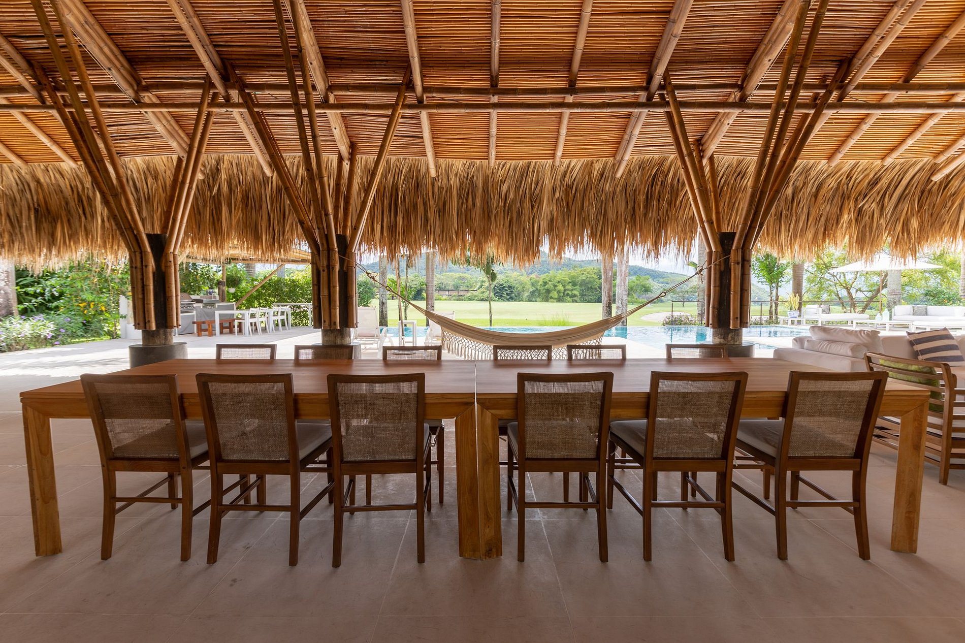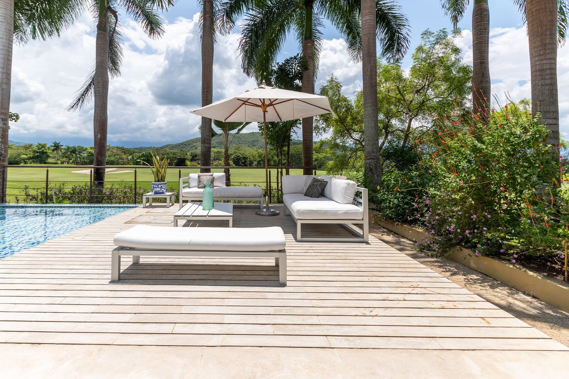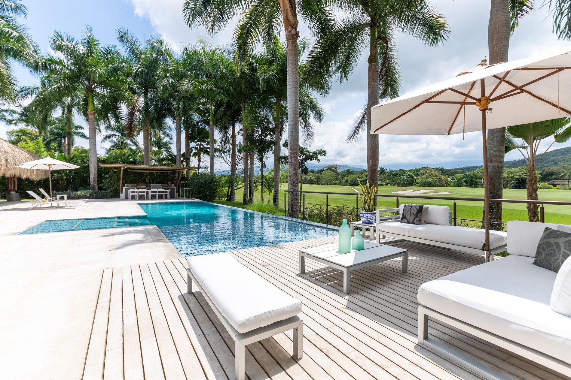 Linda casa con piscina en mosaicos verde azulado, jacuzzi y una espectacular vista al campo de golf hoyo 12. Esta propiedad esta rodeada de hermosas palmeras que le dan un toque tropical y hacen del área social un lugar agradable y placentero. Junto a la piscina encontrará asoleadoras y un espacio para compartir con amigos mientras prepara una deliciosa barbacoa.