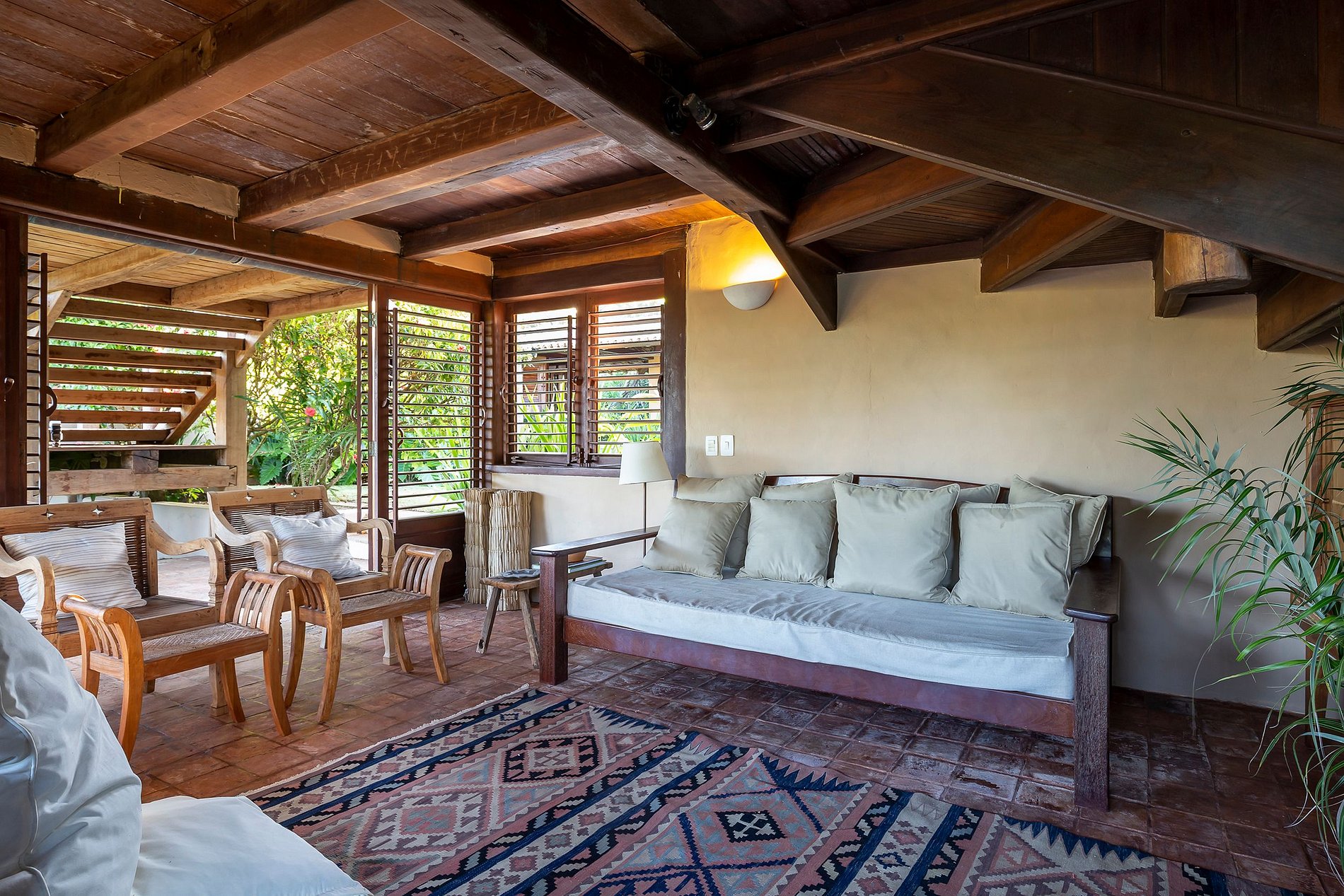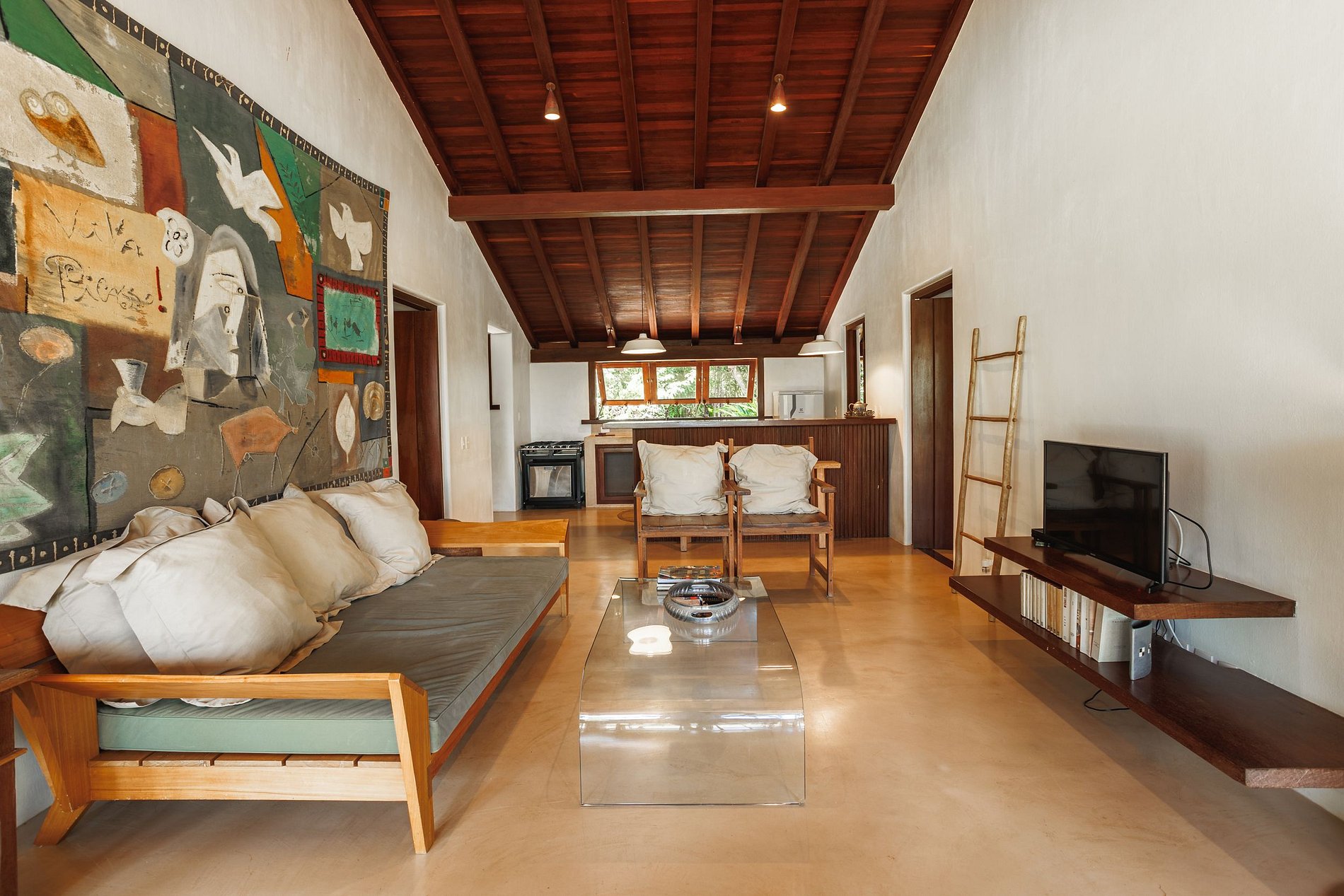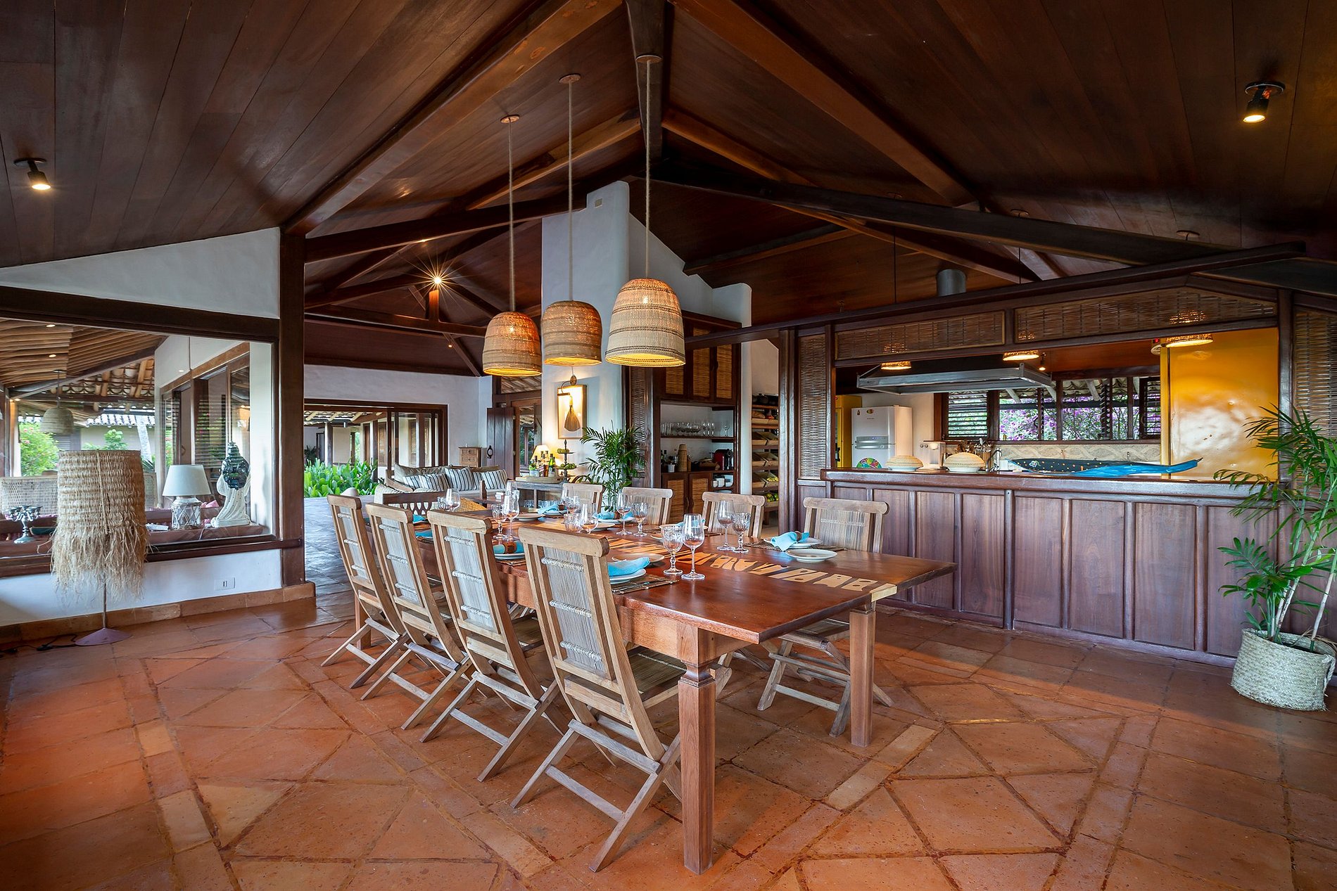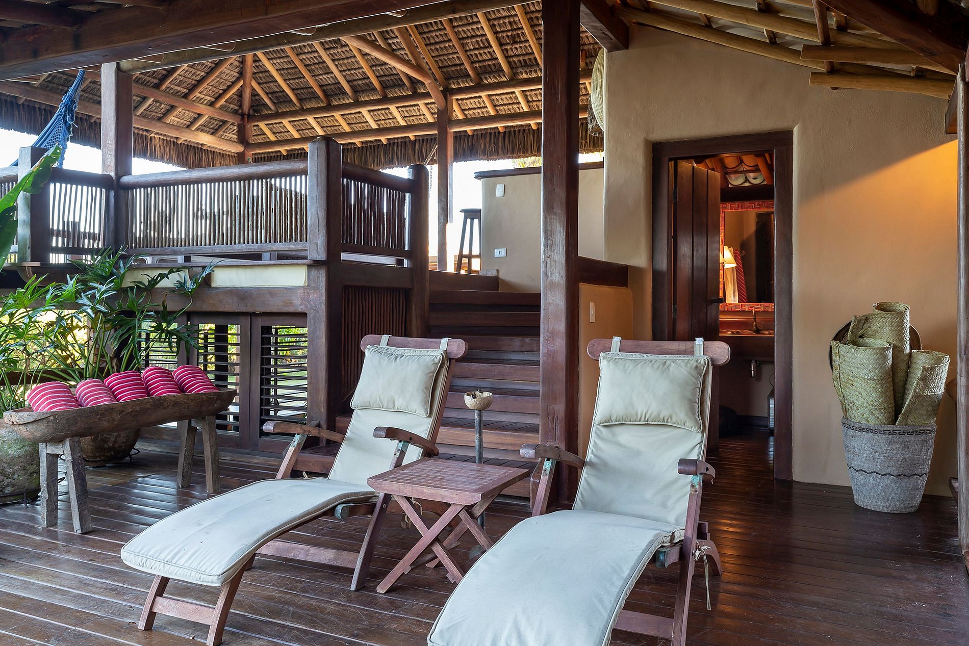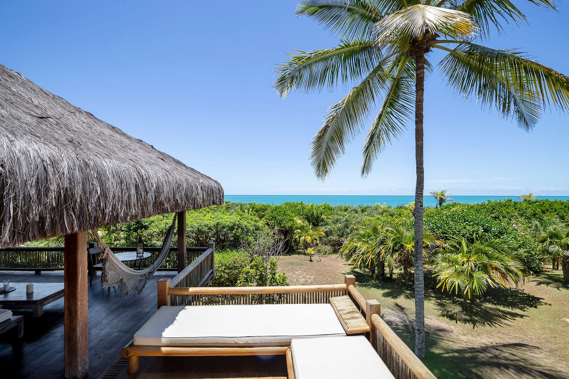 La suite principal, con cama king-size, baño con jacuzzi; 2 habitaciones con camas individuales, que comparten el mismo baño y 2 suites con camas king size y balcón. El comedor con mesa para 12 personas. Cocina completa, con máquina de hielo, horno para pizza, para aprovechar al máximo tu estadía. La sala principal y el comedor tienen puertas de vidrio que se abren a un balcón seguido de una gran terraza de madera con un enorme sofá solárium. La casa rodea un patio abierto con césped y cocoteros. Desde la cubierta principal hay una escalera que baja al césped y otra que sube a un mirador cubierto por una piasava, donde hay un sofá, sillones y una barra cuya vista abarca el mar desde Praia dos Coqueiros (lado norte). hasta Ponta de Itapororoca (lado sur). Una parte del mirador donde hay otro sofá solárium está abierta al cielo. Debajo del cenador hay otra habitación que se puede utilizar como sala adicional o para juegos y relajación donde hay una mesa de ping-pong. Cerca del camino a la playa hay una ducha de agua dulce. La casa de huéspedes, con total privacidad, cuenta con 2 suites, todas con cama king size y aire acondicionado. Rodeado de amplios balcones y un deck que contiene dos sofás solarium, cocina con refrigerador, estufa de 4 hornallas y TV por cable. La casa también ofrece apoyo en la playa con toallas, sillas y tumbonas. Personal: 02 amas de casa, 01 cocinera, 01 ayudante de cocina y 01 cuidador
