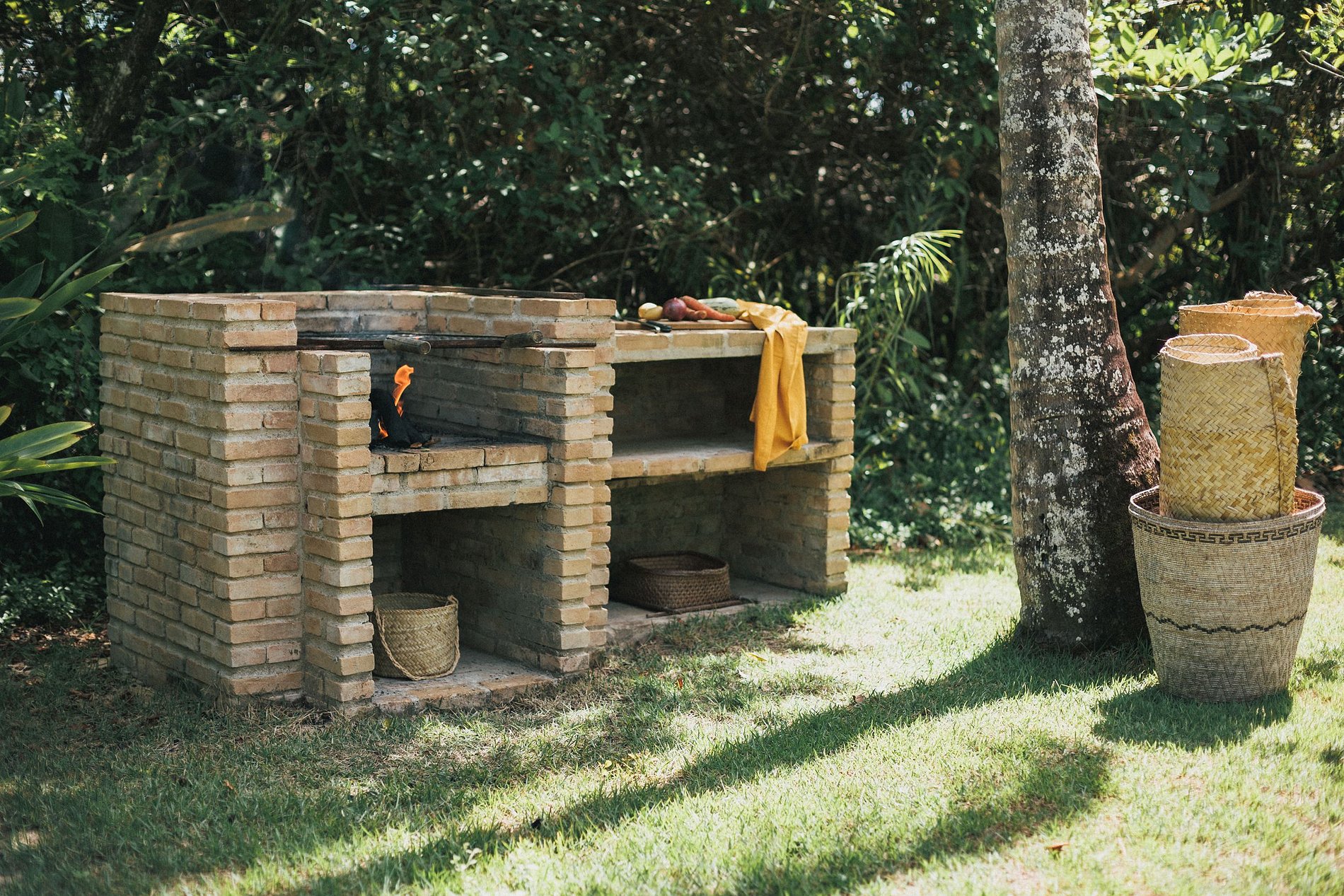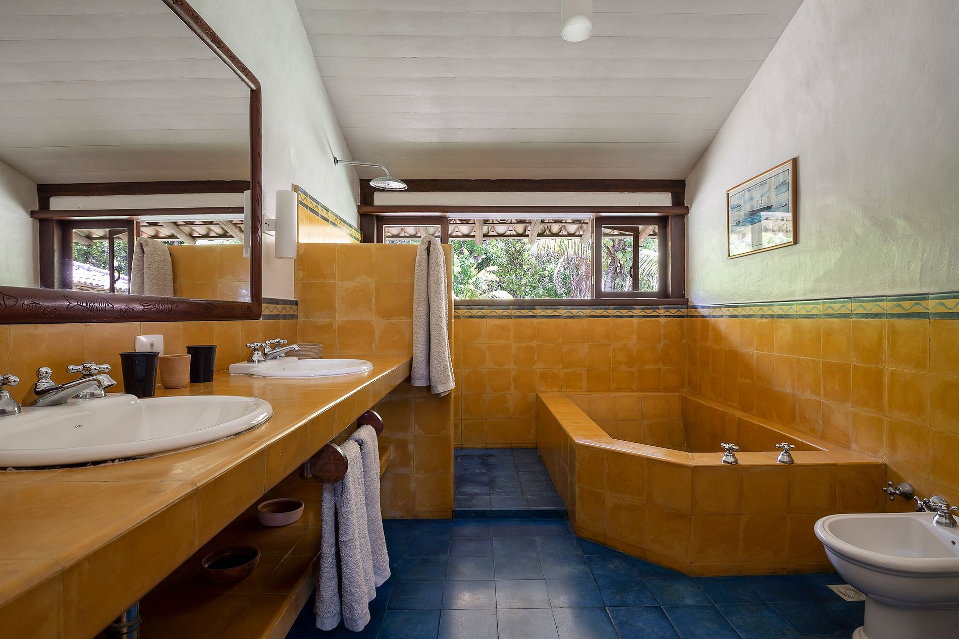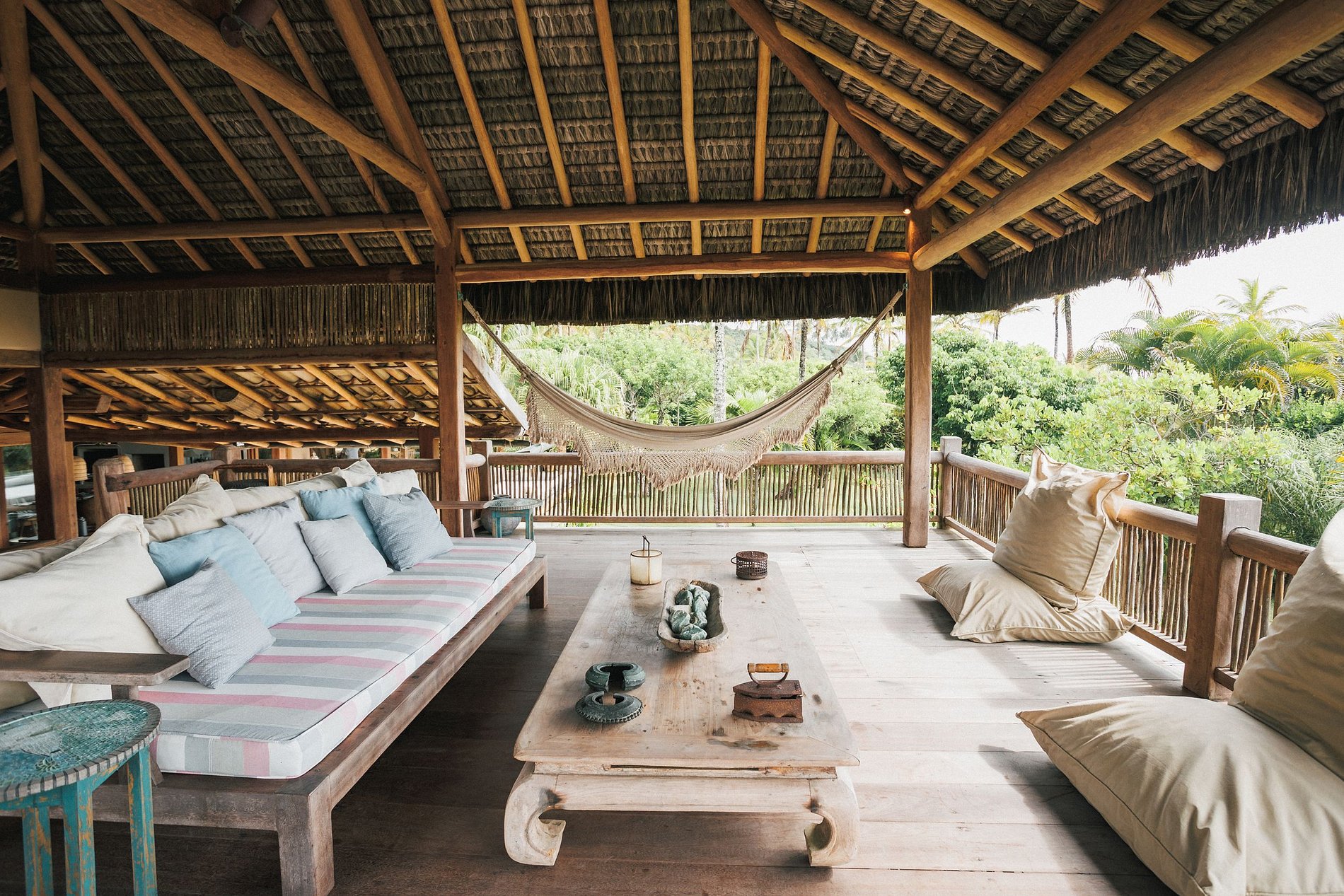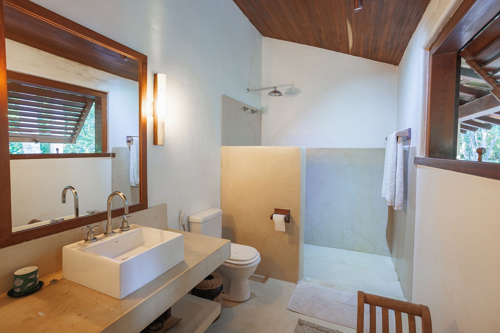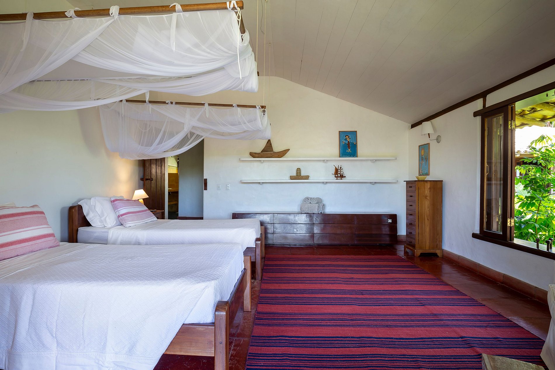 La suite principal, con cama king-size, baño con jacuzzi; 2 habitaciones con camas individuales, que comparten el mismo baño y 2 suites con camas king size y balcón. El comedor con mesa para 12 personas. Cocina completa, con máquina de hielo, horno para pizza, para aprovechar al máximo tu estadía. La sala principal y el comedor tienen puertas de vidrio que se abren a un balcón seguido de una gran terraza de madera con un enorme sofá solárium. La casa rodea un patio abierto con césped y cocoteros. Desde la cubierta principal hay una escalera que baja al césped y otra que sube a un mirador cubierto por una piasava, donde hay un sofá, sillones y una barra cuya vista abarca el mar desde Praia dos Coqueiros (lado norte). hasta Ponta de Itapororoca (lado sur). Una parte del mirador donde hay otro sofá solárium está abierta al cielo. Debajo del cenador hay otra habitación que se puede utilizar como sala adicional o para juegos y relajación donde hay una mesa de ping-pong. Cerca del camino a la playa hay una ducha de agua dulce. La casa de huéspedes, con total privacidad, cuenta con 2 suites, todas con cama king size y aire acondicionado. Rodeado de amplios balcones y un deck que contiene dos sofás solarium, cocina con refrigerador, estufa de 4 hornallas y TV por cable. La casa también ofrece apoyo en la playa con toallas, sillas y tumbonas. Personal: 02 amas de casa, 01 cocinera, 01 ayudante de cocina y 01 cuidador