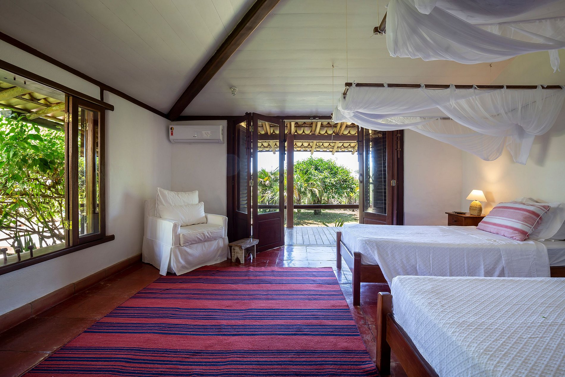 La casa principal, situada a 30 metros del mar, dispone de 5 dormitorios, 3 de los cuales son suites, todos con aire acondicionado.